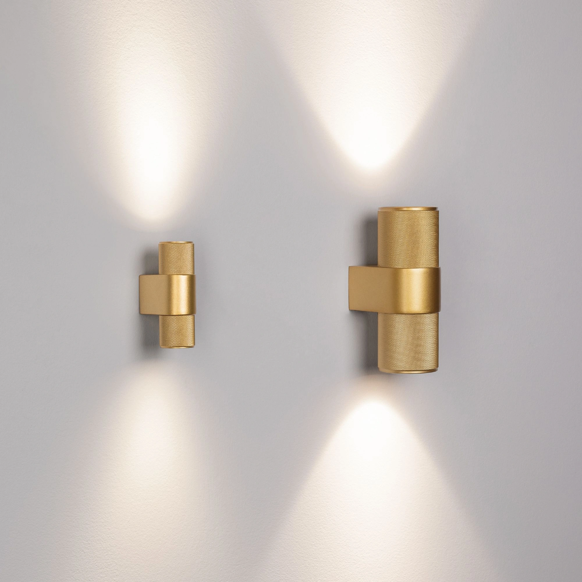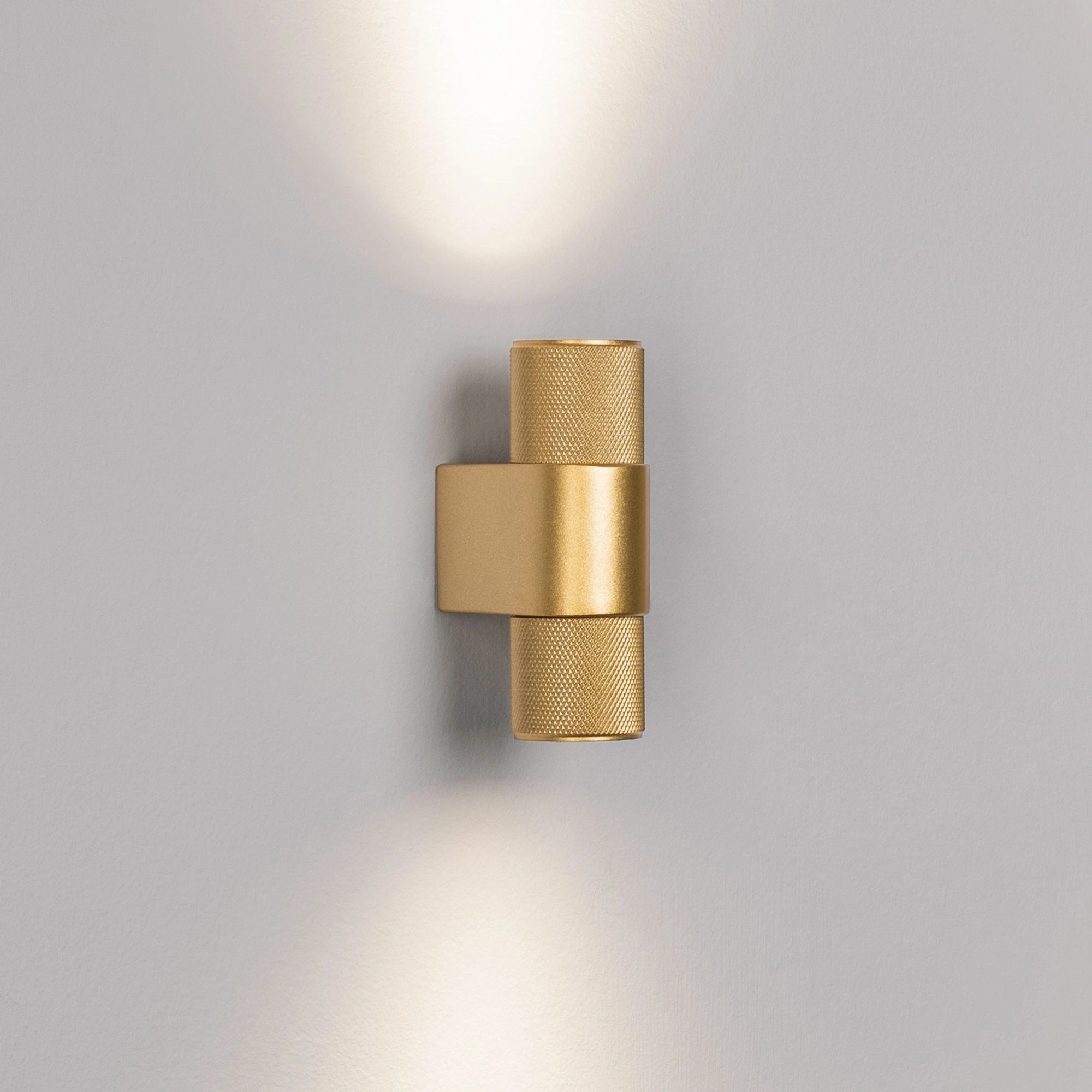 Настенный светильник со свечением в верхнюю и нижнюю полусферу. Мощность 6 Вт, св. поток 350 лм, 60 лм/Вт, дневной 4000 K, CRI>90, угол 40°, напряжение питания 230 В. Золотой фигурный корпус из алюминия, степень защиты IP20. Размер: длина 60 мм, ширина 38,5 мм, высота 104 мм. Монтаж накладной. Драйвер 5-9 В, 700 мА, пульсация <1%.