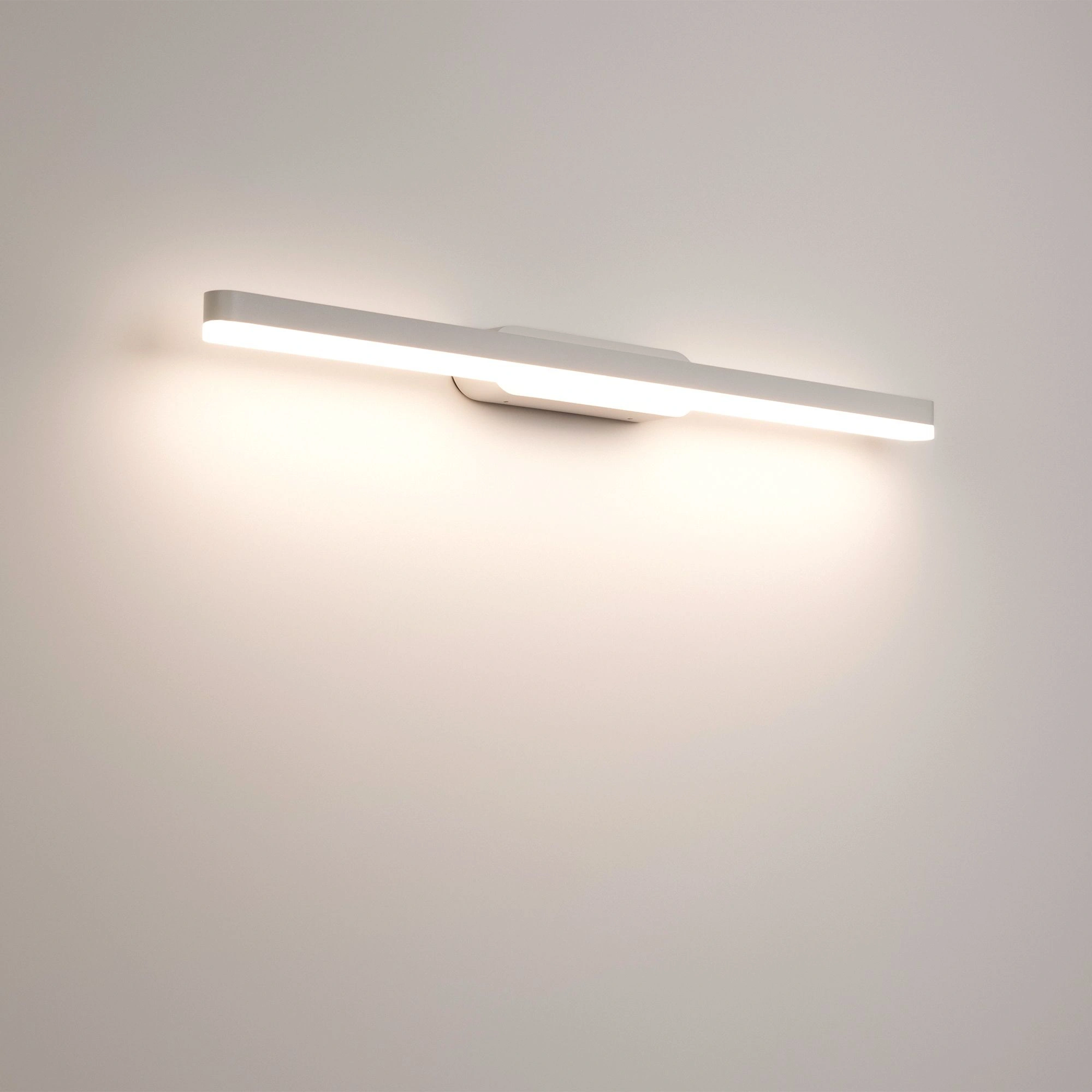 Декоративный настенный светильник. Мощность13 Вт, св. поток 600 лм, 50 лм/Вт, теплый 3000 K, CRI>90, угол 120°, напряжение питания 230 В. Белый фигурный корпус из алюминия, экран из матового поликарбоната, степень защиты IP54. Размер: длина 600 мм, ширина 55 мм, высота 65 мм. Размер светоизлучающего модуля: длина 600 мм, ширина 25 мм, высота 25 мм Монтаж накладной. Пульсация <0,5.