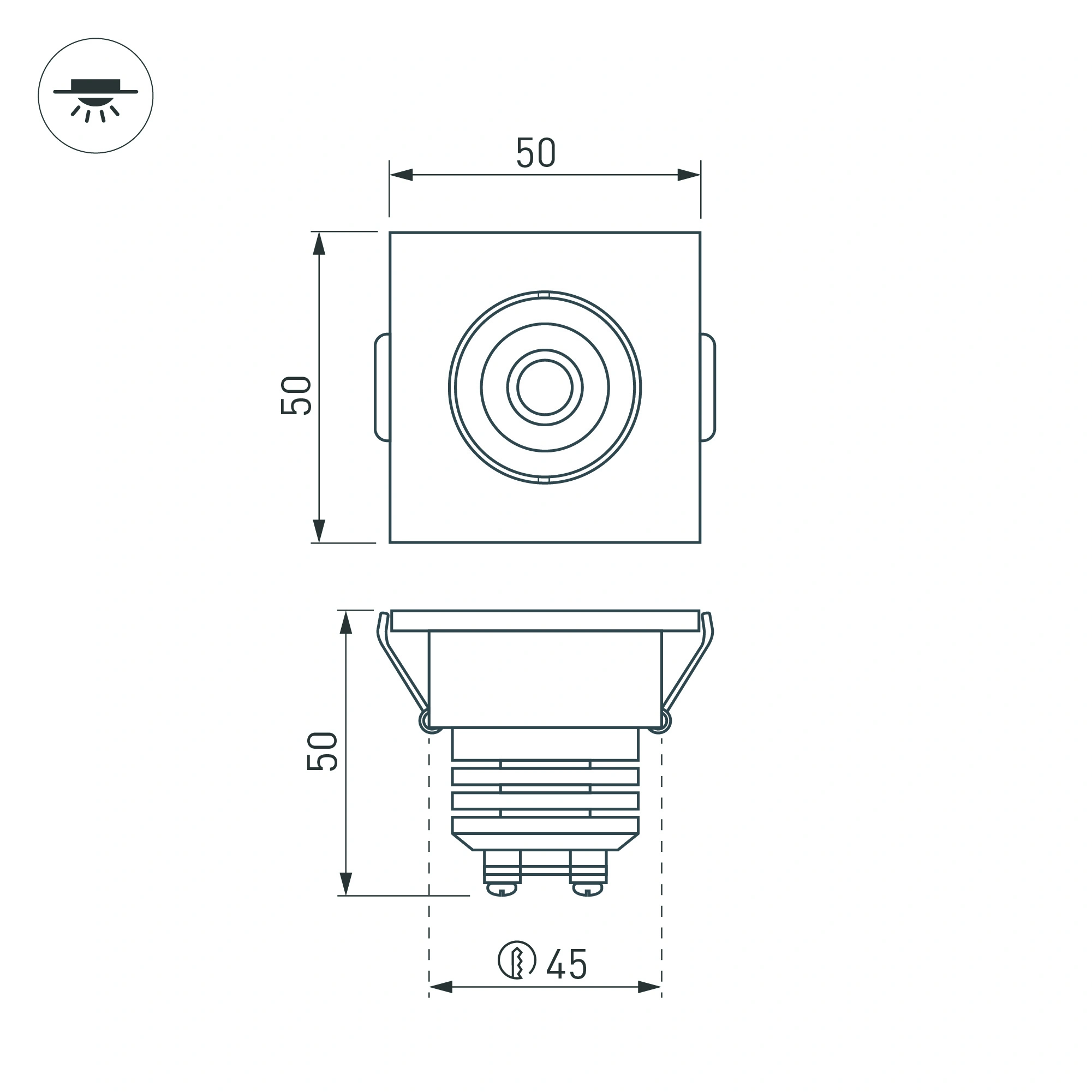 Компактный врезной мебельный светильник LTM-S50x50WH 5W Day White 25deg мощностью 5 Вт с дневным белым цветом свечения (4000 К) для встраивания в мебель, гипсокартонные конструкции и другие поверхности в жилых и общественных помещениях. Светильник с углом излучения 25°, световым потоком 350–400 лм и индексом цветопередачи CRI>80. Легко монтируется в установочное отверстие диаметром 42 мм с помощью пружин. Драйвер для подключения поставляется в комплекте. Возможна регулировка яркости после замены штатного драйвера на диммируемый.
