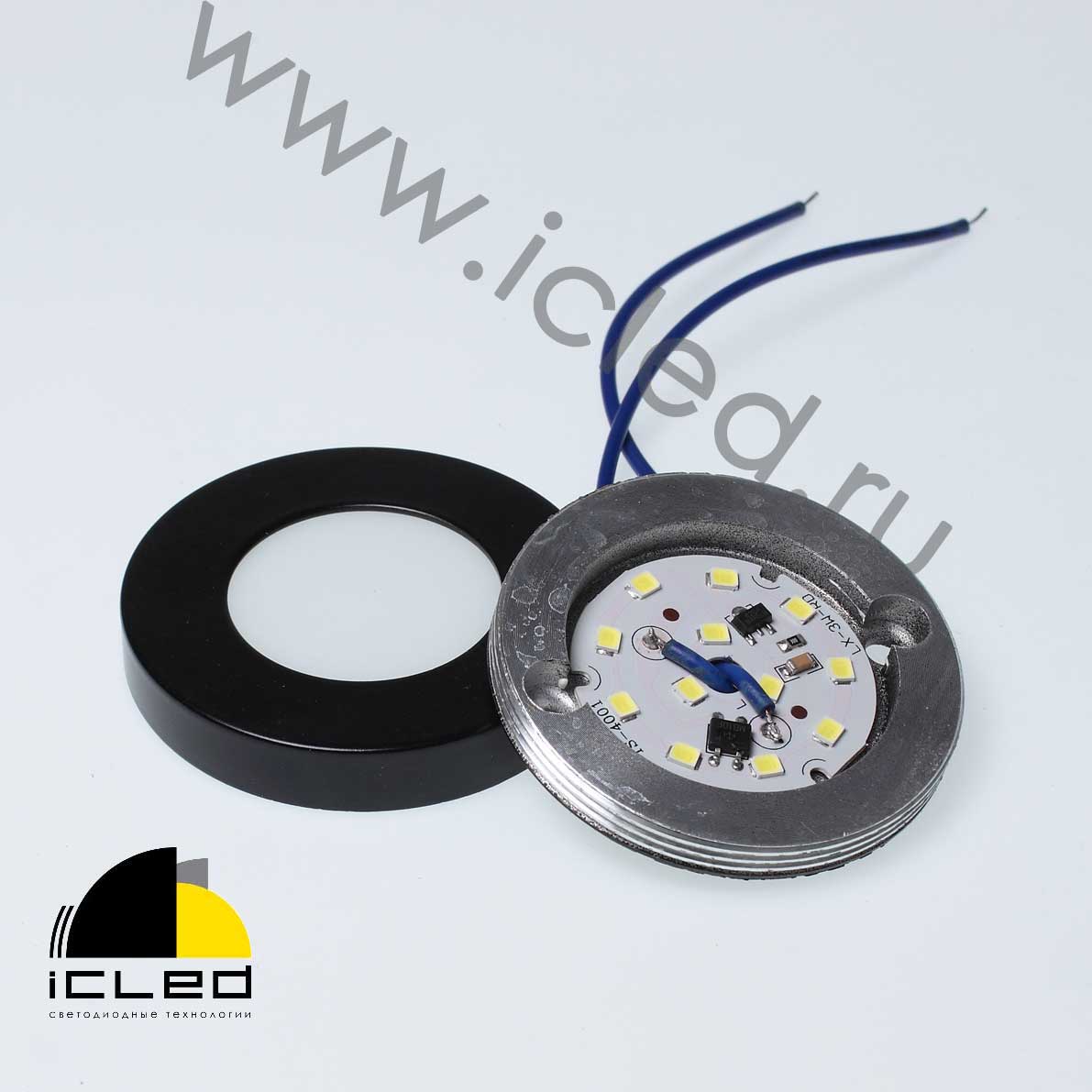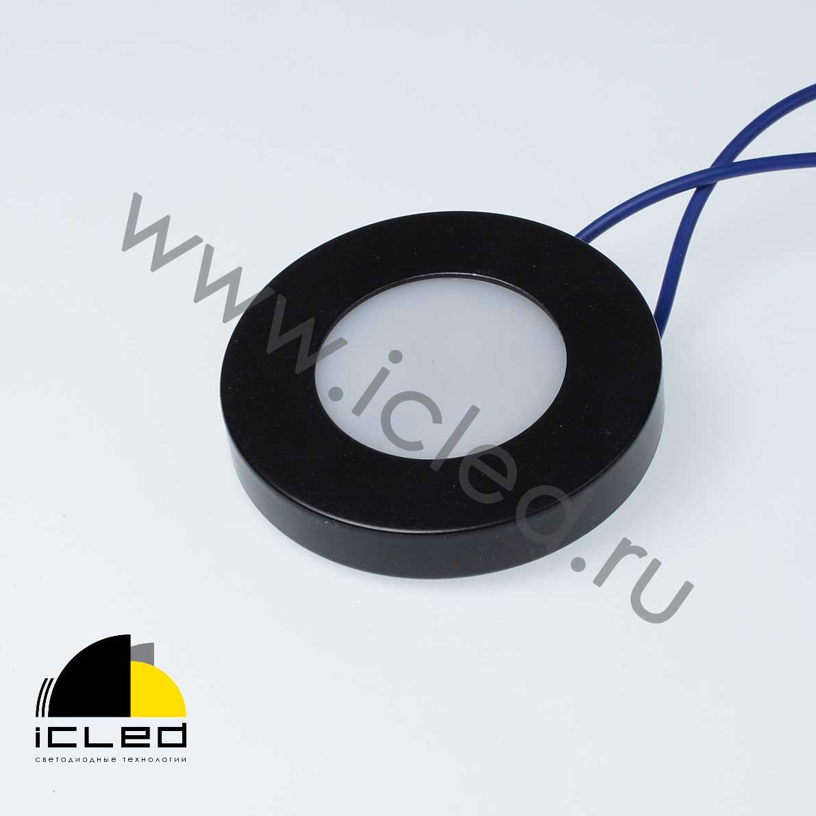 Светильник светодиодный накладной. Цвет корпуса черный. Напряжение 85-265В (подается напрямую на матрицу, без внешнего драйвера), мощность 3Вт, цвет свечения белый 5000-6000К, угол свечения 120 градусов. Диаметр 57мм, высота 10мм. Вес 60г. Используется для подсветки мебели, ниш, витрин. Без внешнего драйвера.