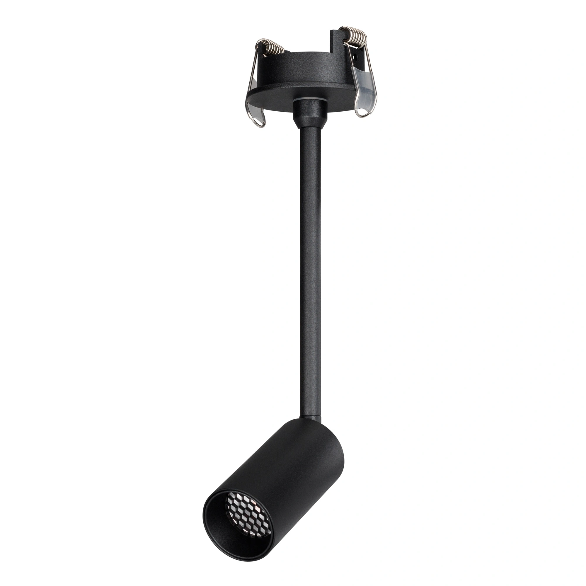 Встраиваемый поворотный светильник с ножкой-подвесом LGD-PERISCOPE-R35-6W Day4000 (BK, 24 deg, 230V) мощностью 6 Вт с белым дневным цветом свечения (4000К), световым потоком 410 лм и высокой световой эффективностью ~60 лм/Вт предназначен для создания равномерного и качественного освещения в интерьере. Высокий индекс цветопередачи CRI>90 удовлетворяет требованиям большинства проектов, так как обеспечивает отличную передачу цветов. Угол освещения составляет 24° и подходит для направленного, акцентного освещения в помещениях. Компактный размер корпуса и возможность монтажа встраиваемым способом позволяют легко устанавливать светильник на любой потолок и создавать различные световые решения в интерьерах. Регулируемый поворот корпуса на 355° и наклон на 90°, а так же ножка подвеса длиной 153 см помогают оперативно настраивать направление света без использования специальных инструментов. Корпус изготовлен из окрашенного алюминия черного цвета, что придает светильнику не только современный стиль, но и обеспечивает защиту от пыли на уровне IP40. Светильник предназначен для применения внутри помещений, где нет контакта с водой или другими жидкостями. Снабжен встроенным драйвером, что дает возможность безопасно и быстро подключать его напрямую к сети 230 В. Пульсация менее 5% обеспечивает комфортное освещение без мерцания. Идеально подходит для акцентного освещения и декоративного оформления в жилых помещениях, офисах, барах, ресторанах, торговых и выставочных залах.