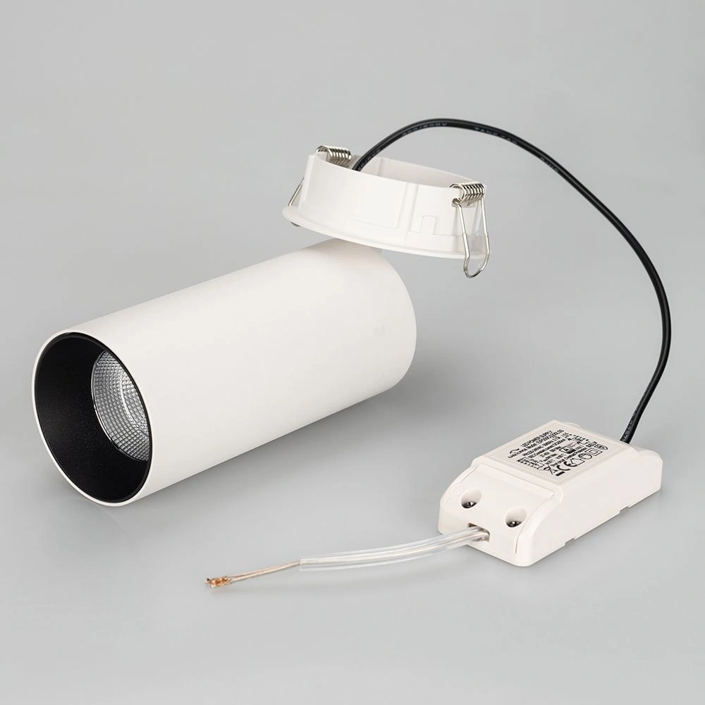 Встраиваемый откидной светильник SP-POLO-BUILT-R65-8W Day4000 (WH-BK, 40 deg) мощностью 8 Вт с дневным белым цветом свечения (4000 К). Индекс цветопередачи CRI>80 обеспечивает качественный свет, не вызывающий переутомления глаз. Компактный цилиндрический корпус совместим с разными типами потолков, а окрашенная декоративная вставка придаст оригинальность в любом интерьере. Откидной механизм предусматривает возможность быстрой регулировки направления света. Световой поток 570 лм и узкий угол излучения 40° для акцентного и локального освещения, а также для реализации дизайнерских решений в разных помещениях. Монтируется в монтажное отверстие Ø75 мм. Драйвер для подключения к сети 230 В поставляется в комплекте.