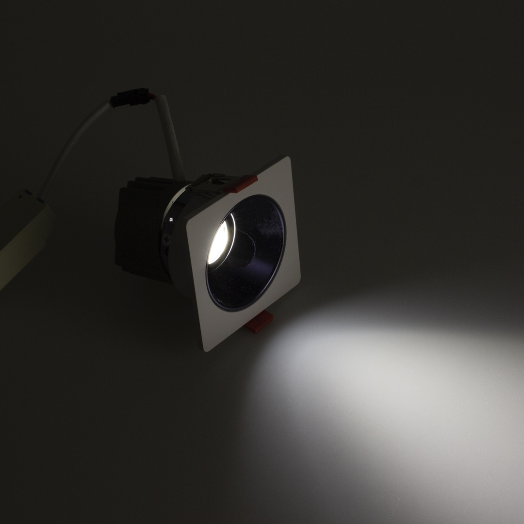Светодиодный светильник встраиваемый. Квадратный белый корпус с черной вставкой. Напряжение 100-265V, мощность 5W, цвет свечения дневной белый 4000-4500K, световой поток 600Lm, размеры 88х88мм, угол свечения 30 градусов. Установочный диаметр 80мм, высота 60мм. Комплектуется драйвером 14-19V, 280mA. Размеры упаковки 100х100х100мм. Вес 300г.