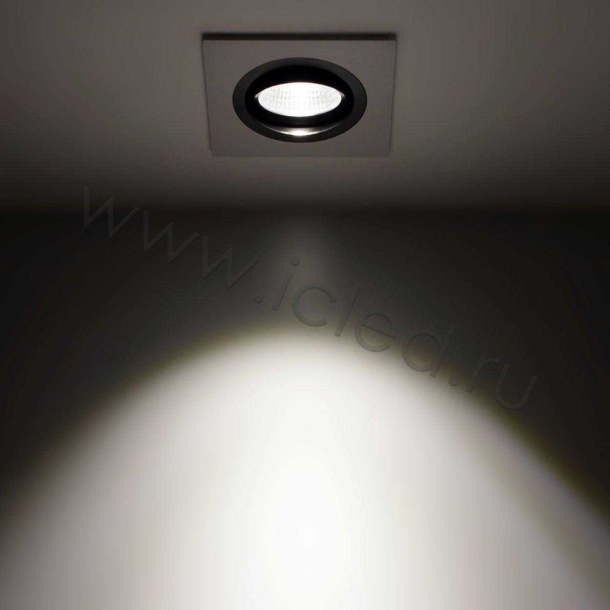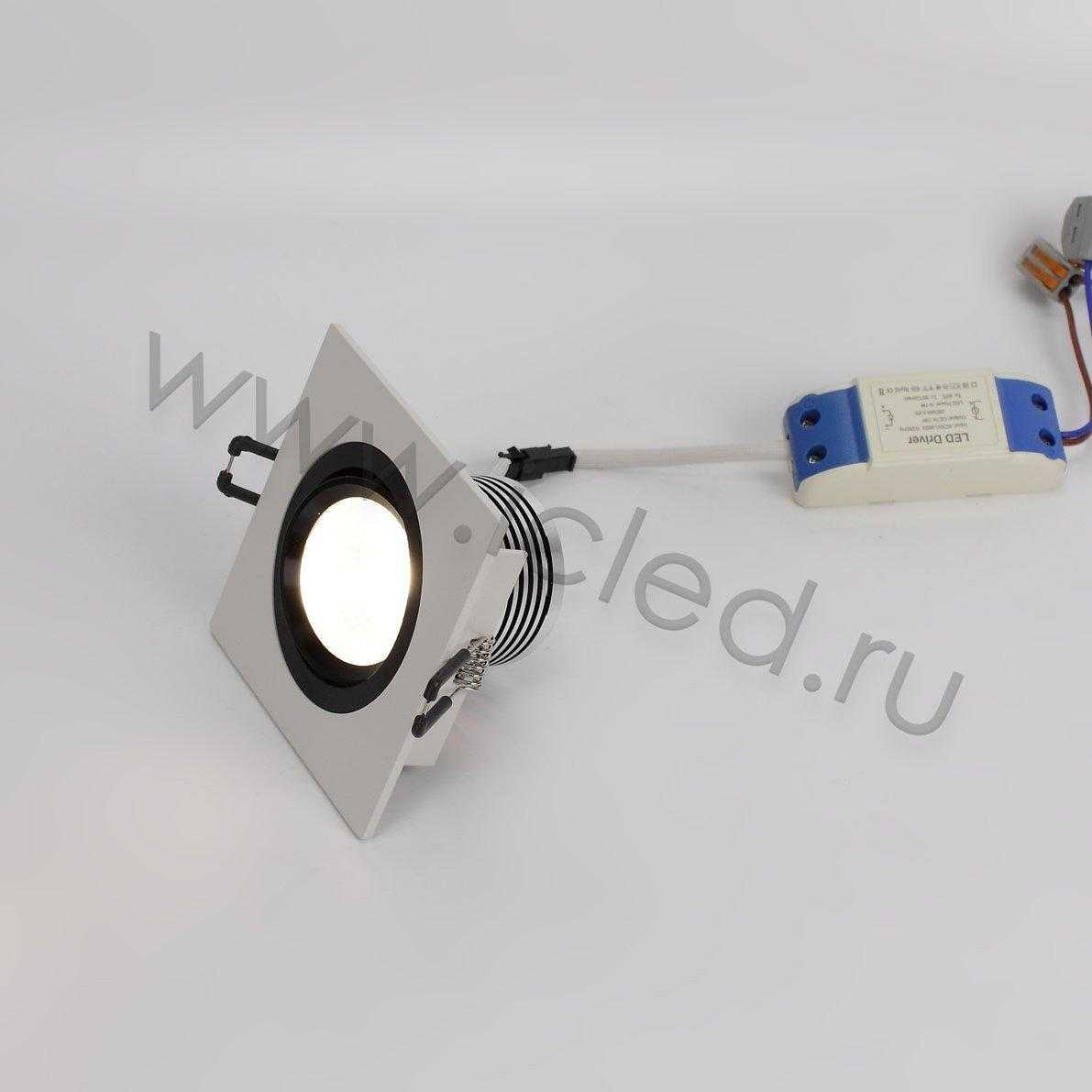 Светодиодный светильник. Квадратный белый корпус. Напряжение 220V, мощность 5W, цвет свечения дневной белый 4000-4500K, световой поток 600Lm, угол свечения 60 градусов. Размеры 99x99x65, установочные размеры 85x75мм.