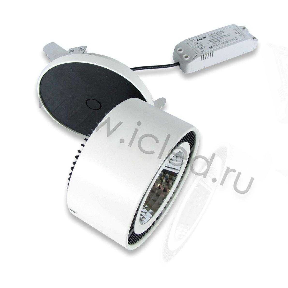 Встраиваемый потолочный светодиодный светильник. Круглый, белый с черным корпус с отражателем. Напряжение 110-230V, мощность 23W, цвет свечения дневной белый 4000-4500K, световой поток 1772Lm, угол свечения 18-30 градусов. Диаметр 125мм.