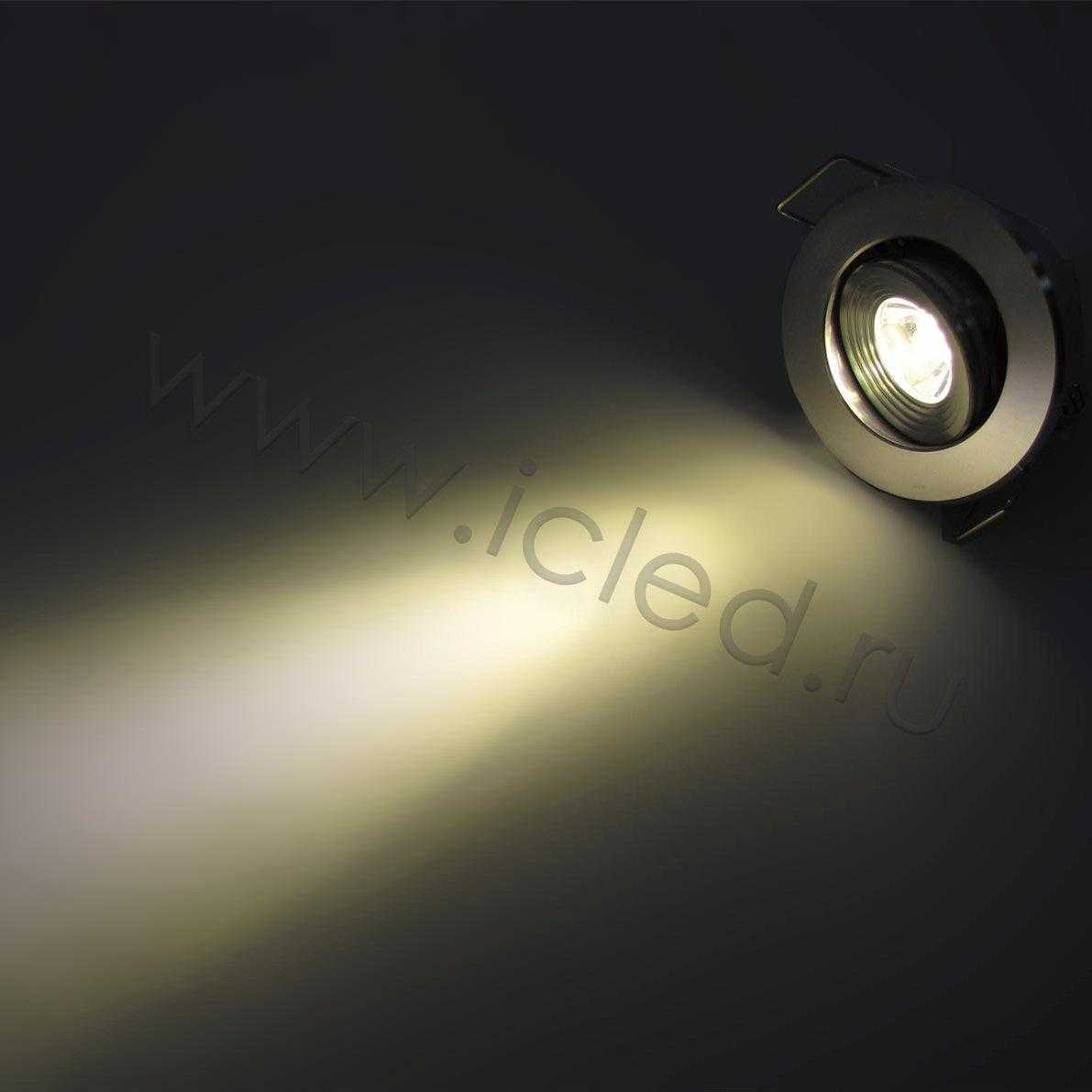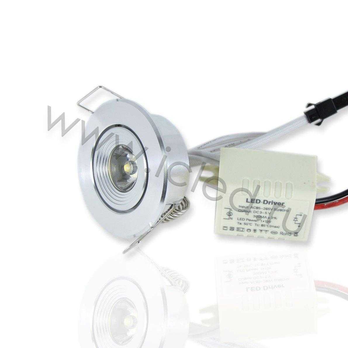Точечный светодиодный светильник. Тип светодиода emmiter 1W - 1штука, цвет свечения теплый белый 3000-3200K, световой поток 100Lm, серебристый корпус. Напряжение 220V, мощность 1W, драйвер в комплекте. Диаметр 52мм.