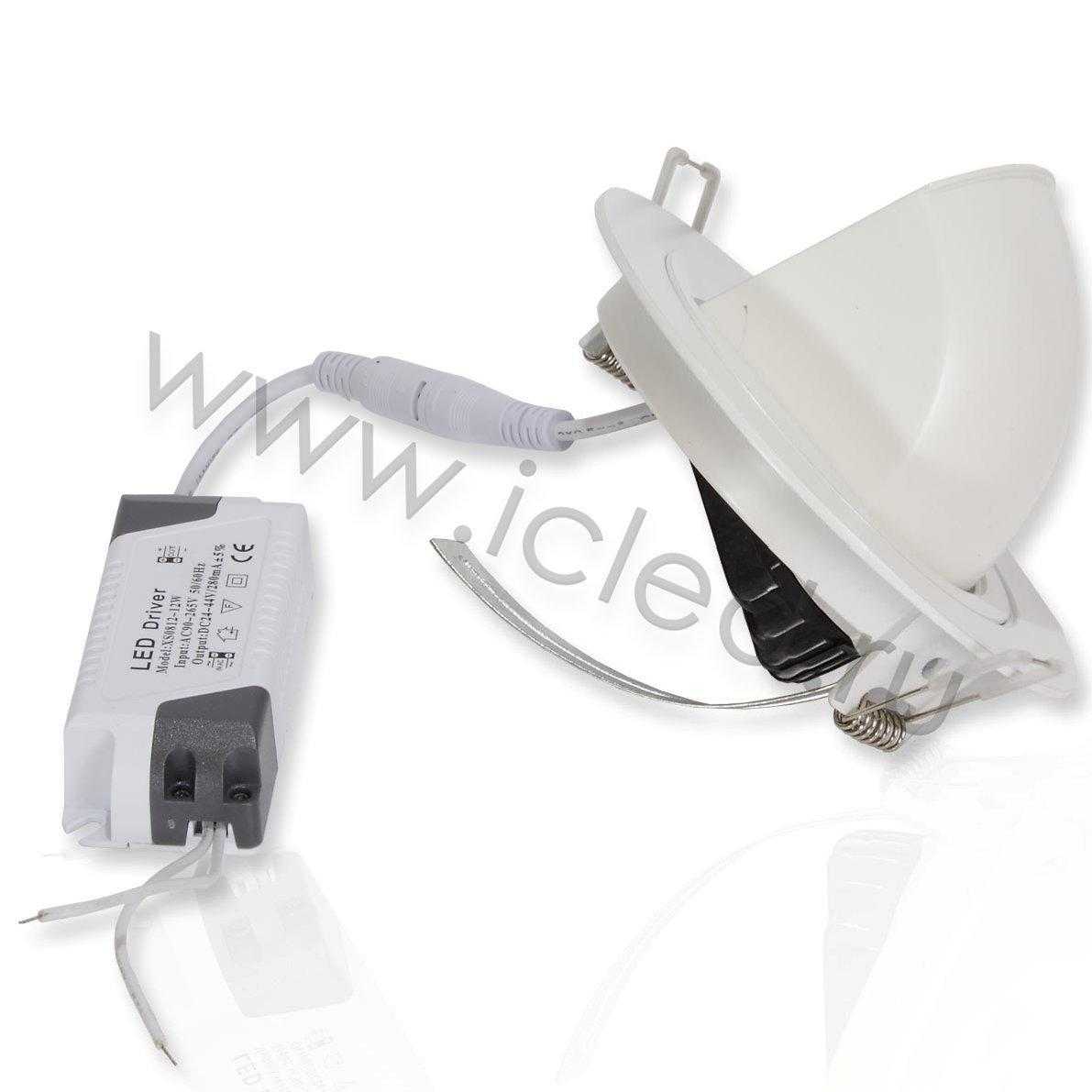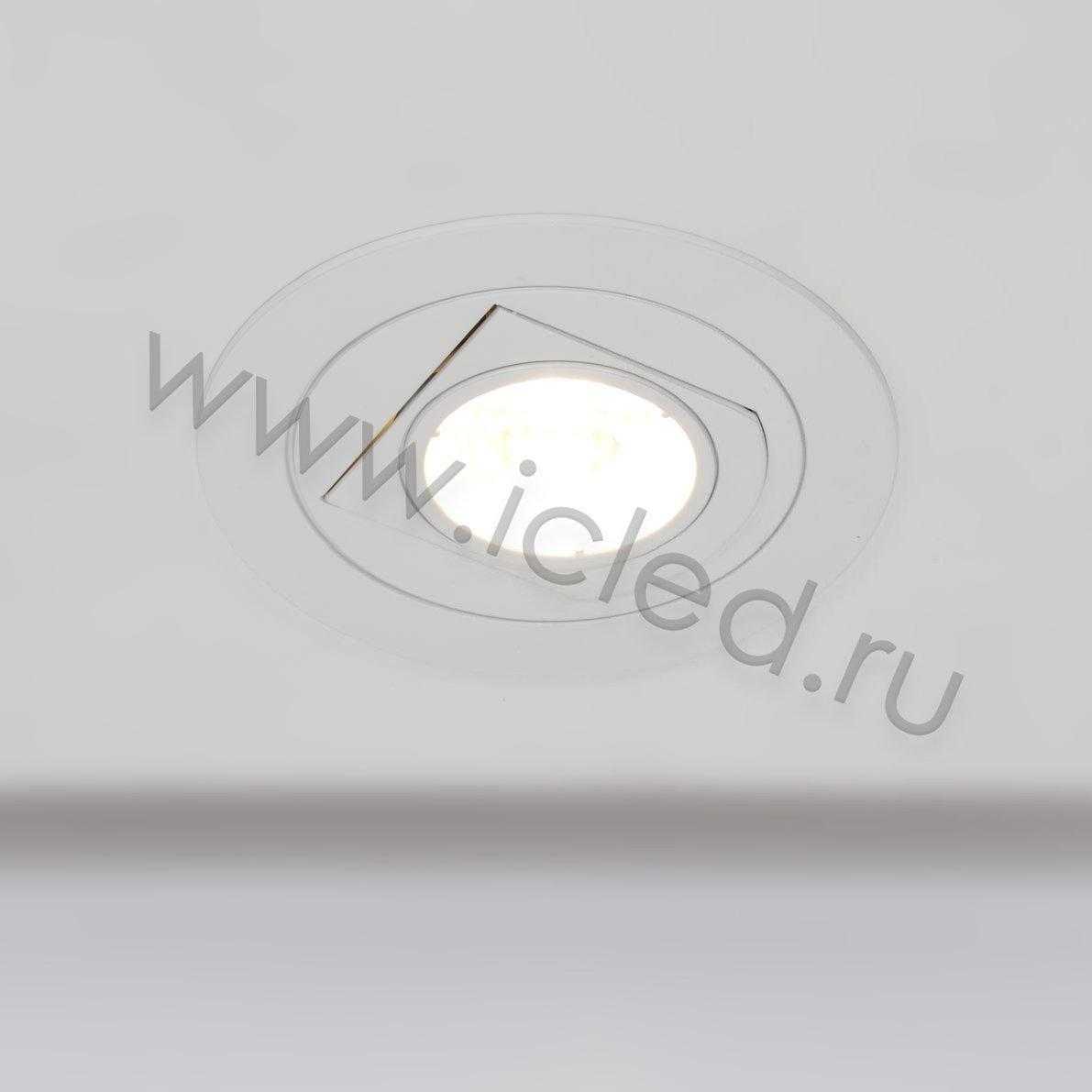 Светодиодный светильник встраиваемый с изменяемым направлением освещения. Белый корпус. Напряжение 85-265V, мощность 10W, цвет свечения теплый белый 3000K, световой поток 1000Lm, угол свечения 30 градусов. Диаметр 130мм, высота 80мм. Установочный диаметр 115мм.