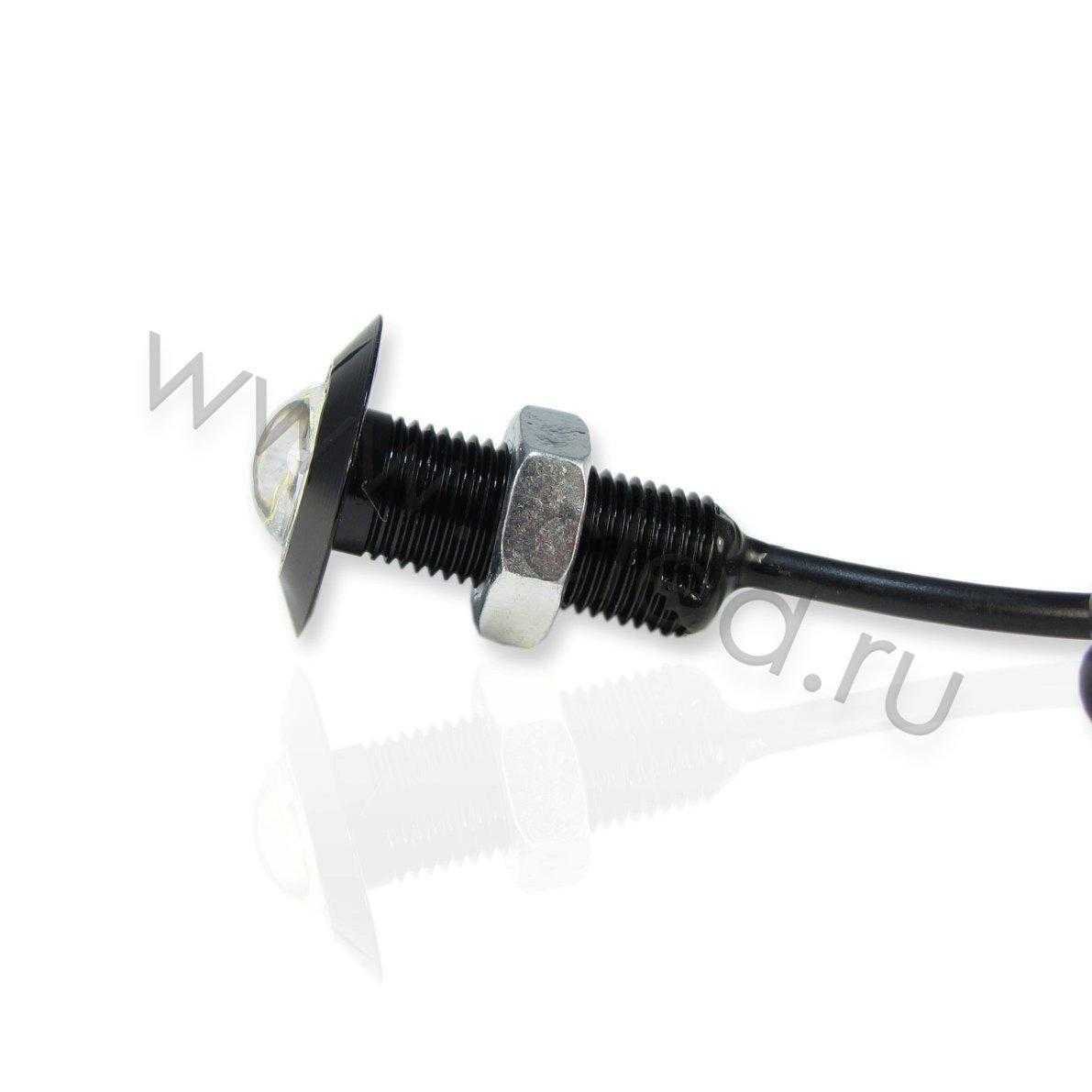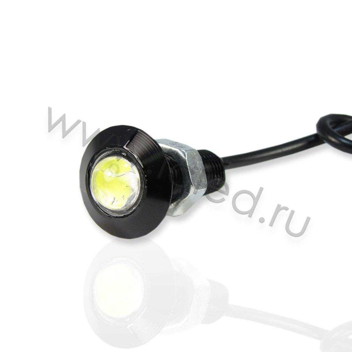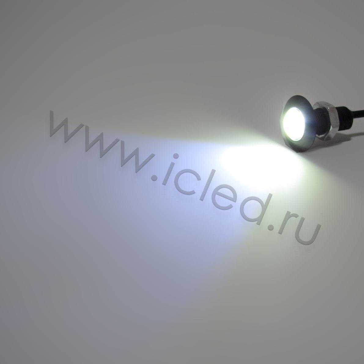 Точечный светодиодный светильник. Миниатюрный черный корпус. Цвет свечения белый 6000K, световой поток 70Lm. Угол свечения 30 градусов. Напряжение 12V, мощность 1W. Диаметр 22мм, высота 35мм. Длина провода 400мм. Степень защиты IP65. Диаметр установочного отверстия 10мм. Вес 12г.