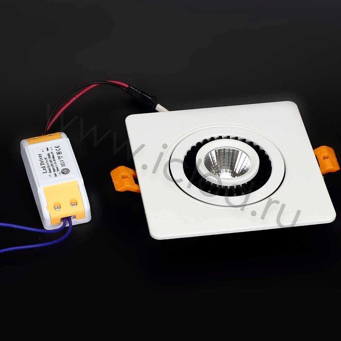 Светодиодный светильник встраиваемый. Прямоугольный белый корпус. Напряжение 85-265V, мощность 7W, цвет свечения дневной белый 4000-4500K, световой поток 700Lm. Угол свечения 60 градусов, изменяемый наклон свечения. Размеры 118х118х45мм. Установочные размеры 95х95мм. Вес 270гр.