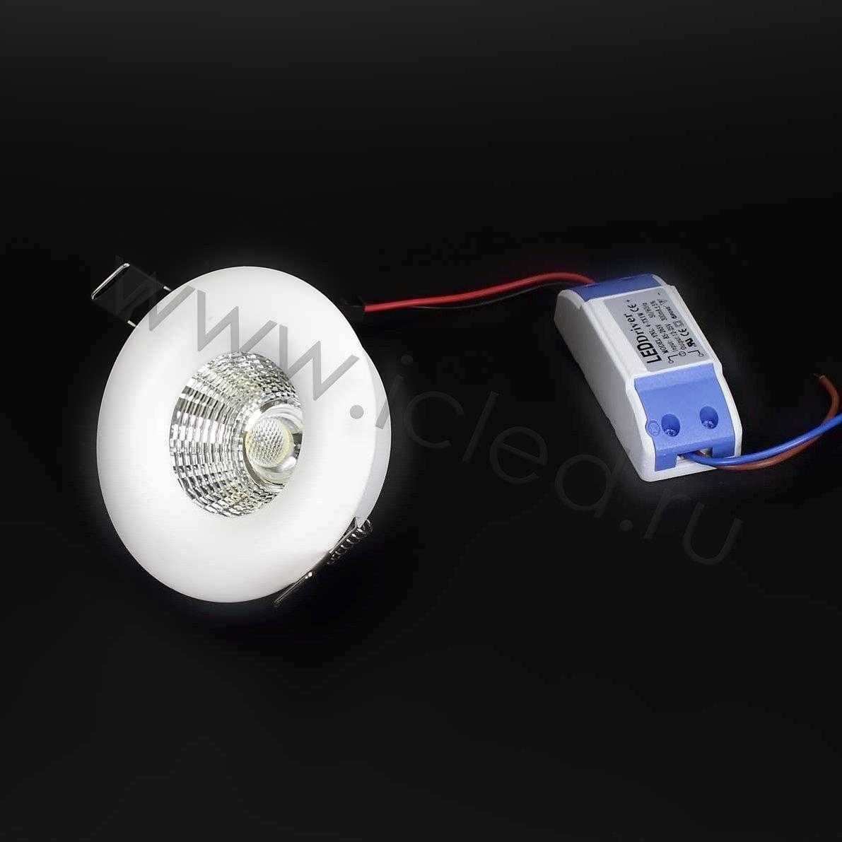 Светодиодный светильник встраиваемый. Круглый белый корпус. Напряжение 85-265V, мощность 7W, цвет свечения теплый белый 3000-3500K, световой поток 700Lm, угол свечения 45 градусов. Диаметр 86мм, высота 55мм, установочный диаметр 76мм. Вес 180гр.