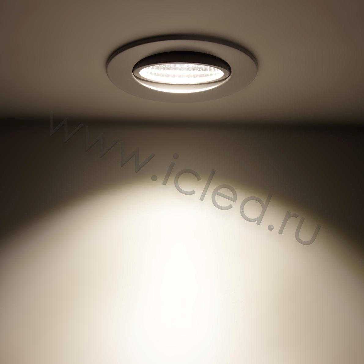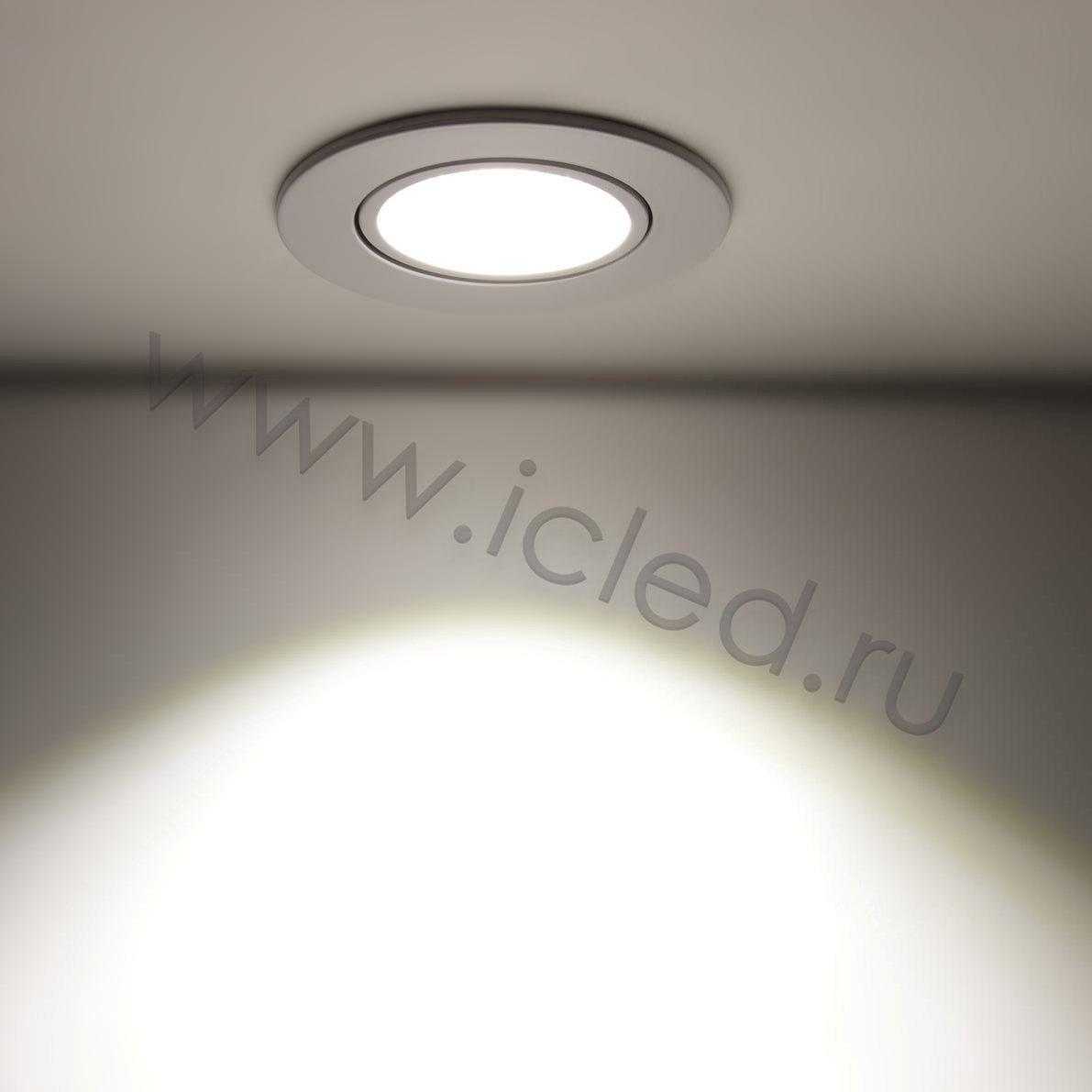 Потолочный поворотный светодиодный светильник. Круглый белый корпус. Диаметр 85мм (под отверстие 75мм). Напряжение 85-265V, мощность 5W, цвет свечения дневной белый 4000-4500K, световой поток 500Lm, угол свечения 60 градусов.