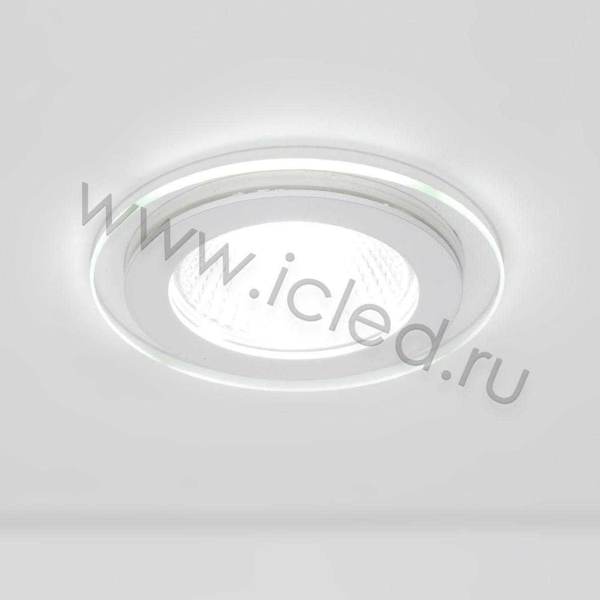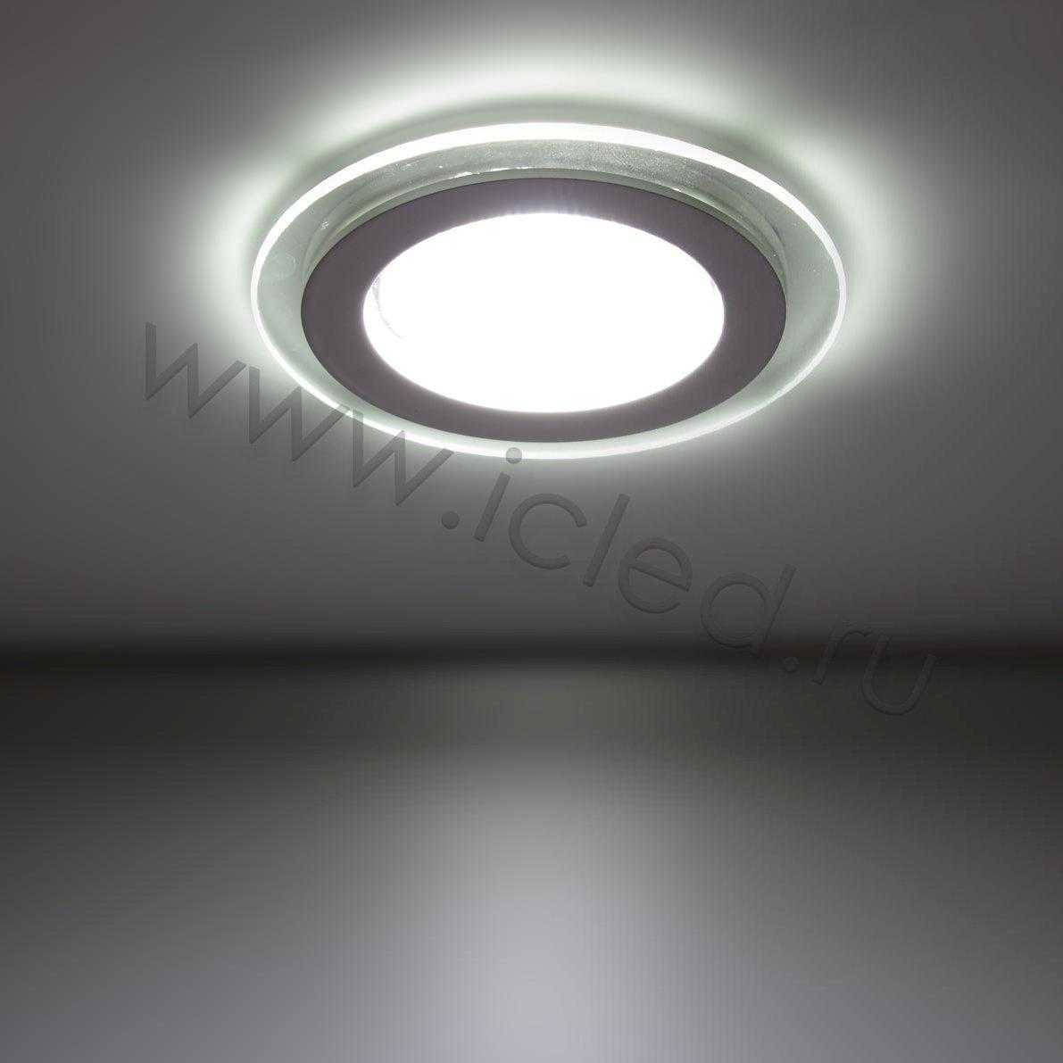 Потолочный светодиодный светильник с декоративным стеклом. Круглый белый корпус с прозрачной стеклянной рамкой. Диаметр 100мм (под отверстие 75мм). Напряжение 85-265V, мощность 5W, цвет свечения белый 6000K, световой поток 500Lm, угол свечения 90 градусов.