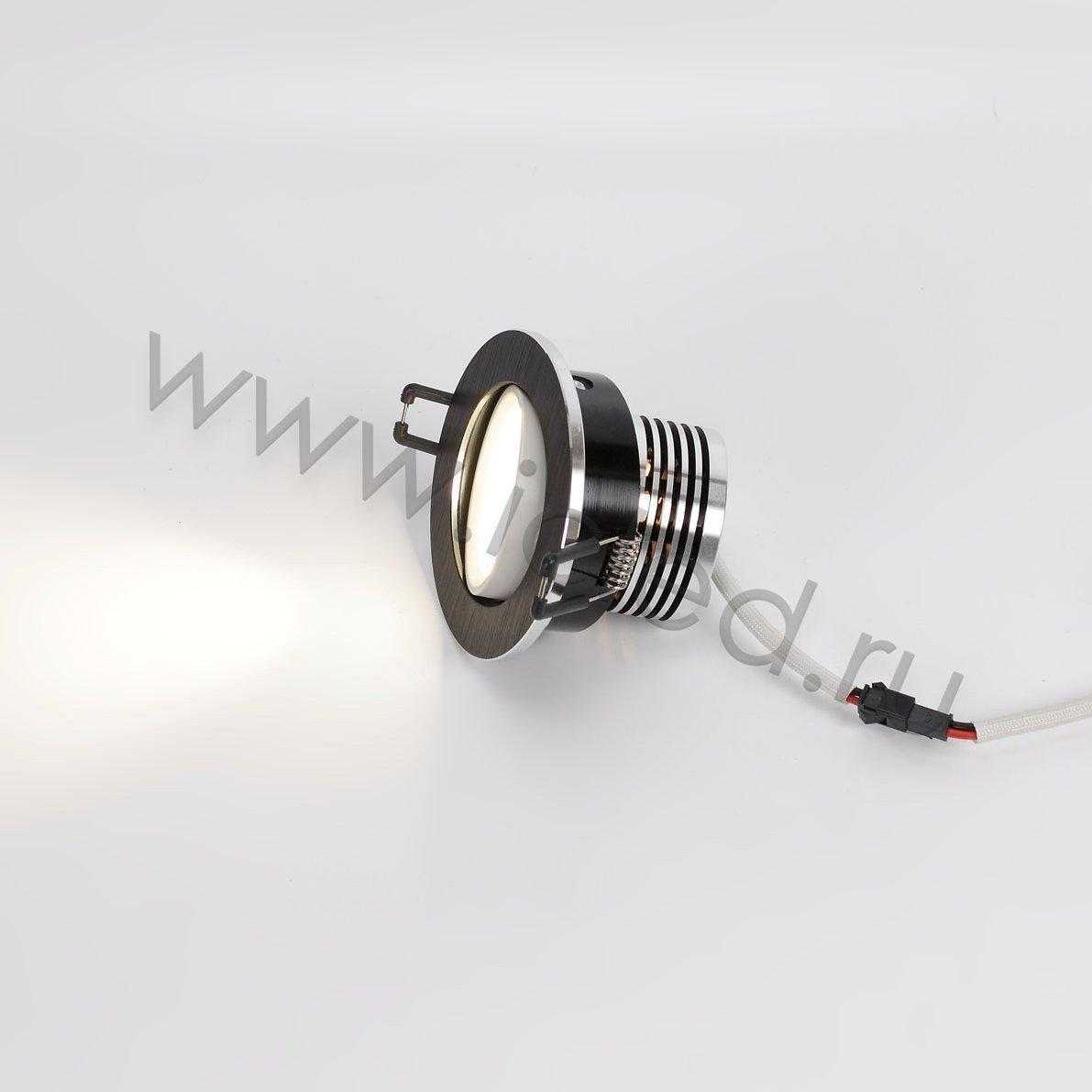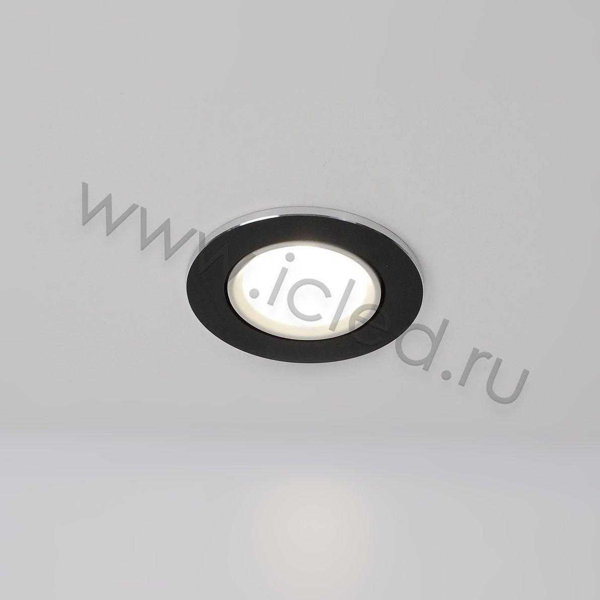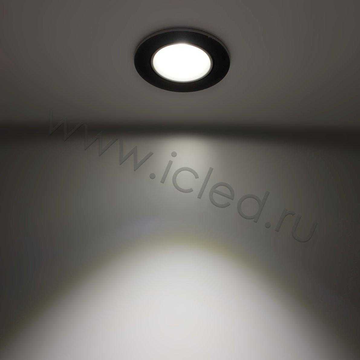 Светодиодный светильник. Круглый черный корпус. Напряжение 220V, мощность 5W, цвет свечения дневной белый 4000-4500K, световой поток 600Lm, диаметр 86мм, угол свечения 60 градусов. Установочный диаметр 75мм, высота 60мм.