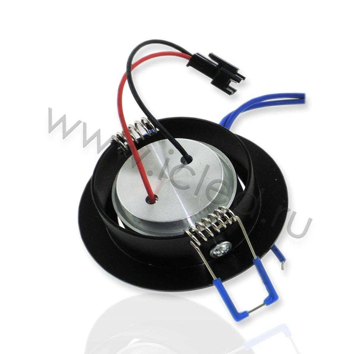 Точечный светодиодный светильник. Корпус круглый. Черное обрамление. Напряжение 220V, мощность 1W, цвет свечения теплый белый 3000-3300K, световой поток 90Lm. Размеры 68x24x51мм.