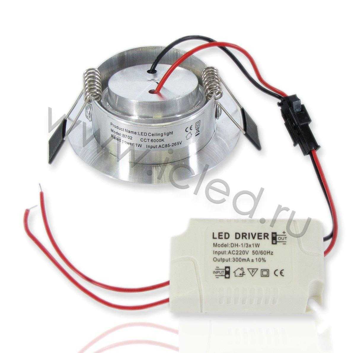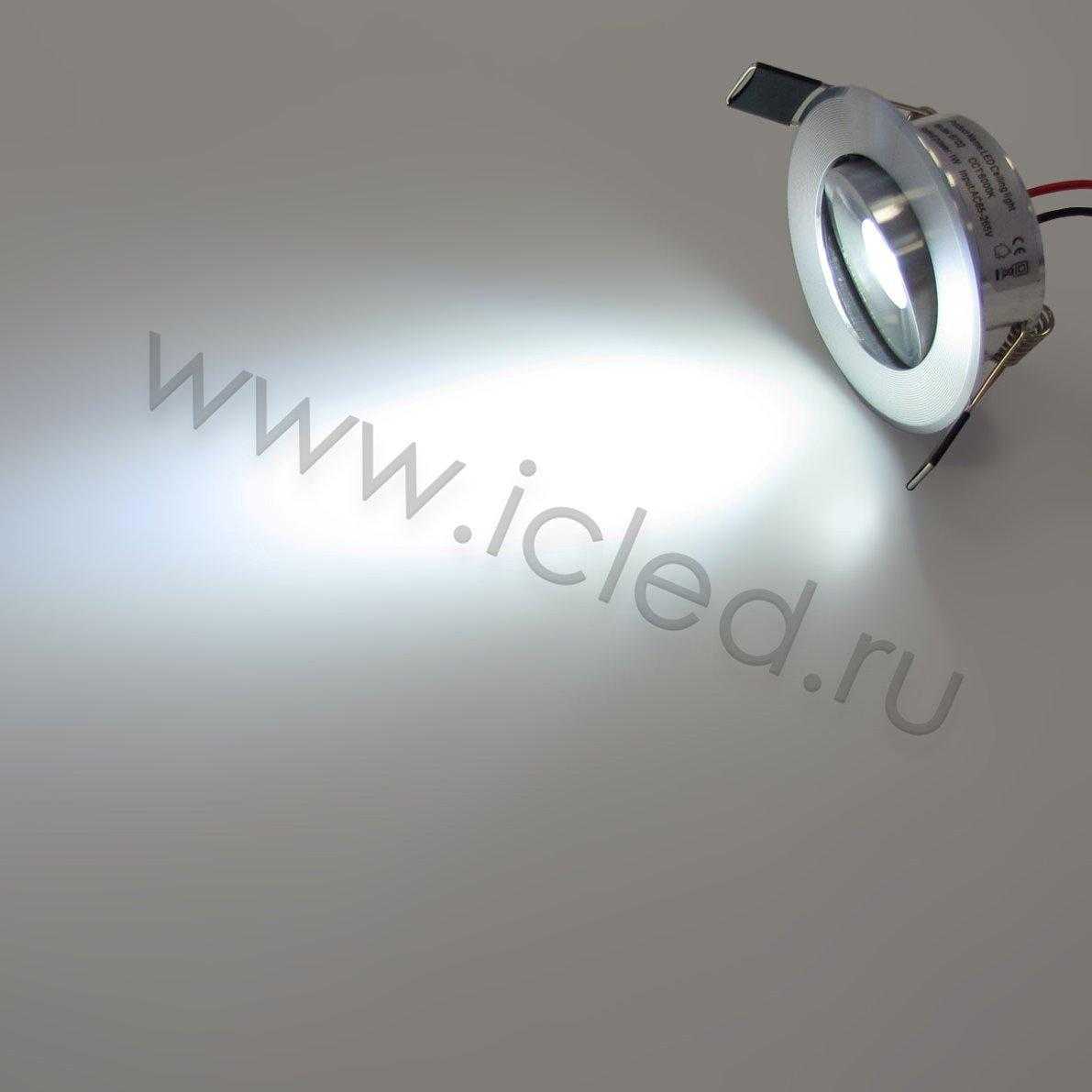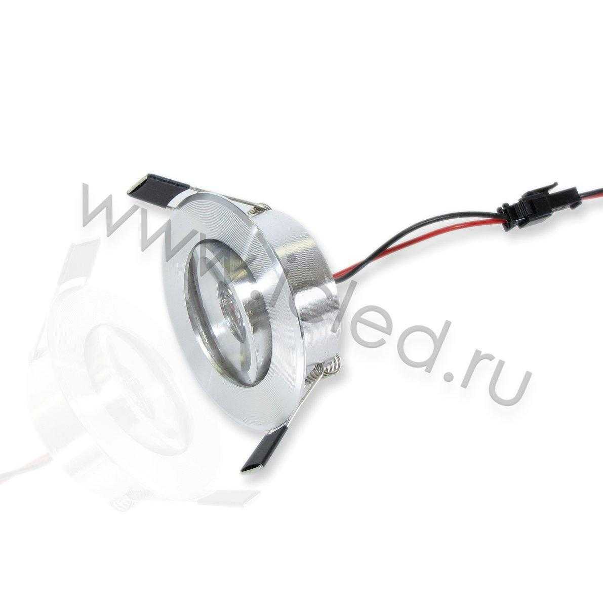 Точечный светодиодный светильник. Корпус круглый серебристый. Напряжение 220V, мощность 1W, цвет свечения белый 6000-6300K, световой поток 90Lm. Размеры 67x24мм.