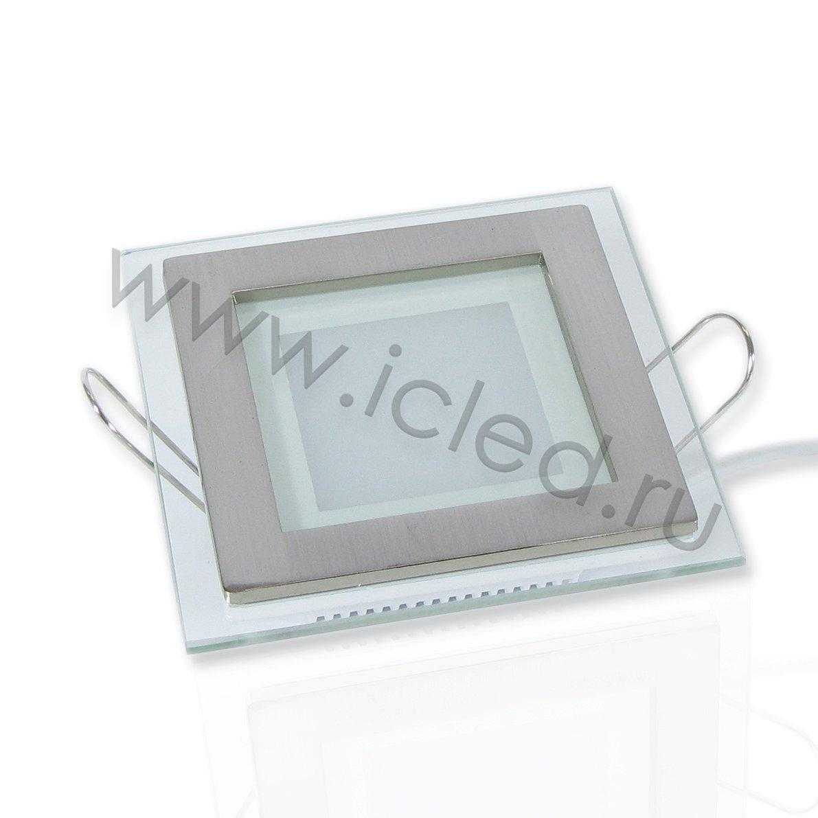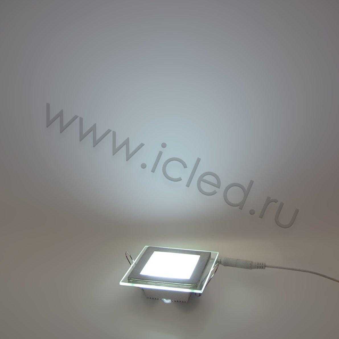Потолочный светодиодный светильник с декоративным стеклом. Квадратный серебристый корпус с прозрачной стеклянной рамкой. Размер 97x97мм (под отверстие 76x76мм). Напряжение 85-265V, мощность 6W, цвет свечения белый 6000-6500K, световой поток 310Lm.
