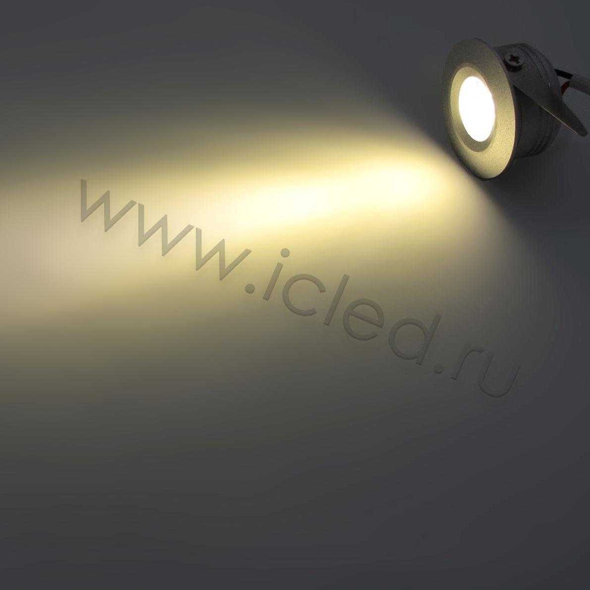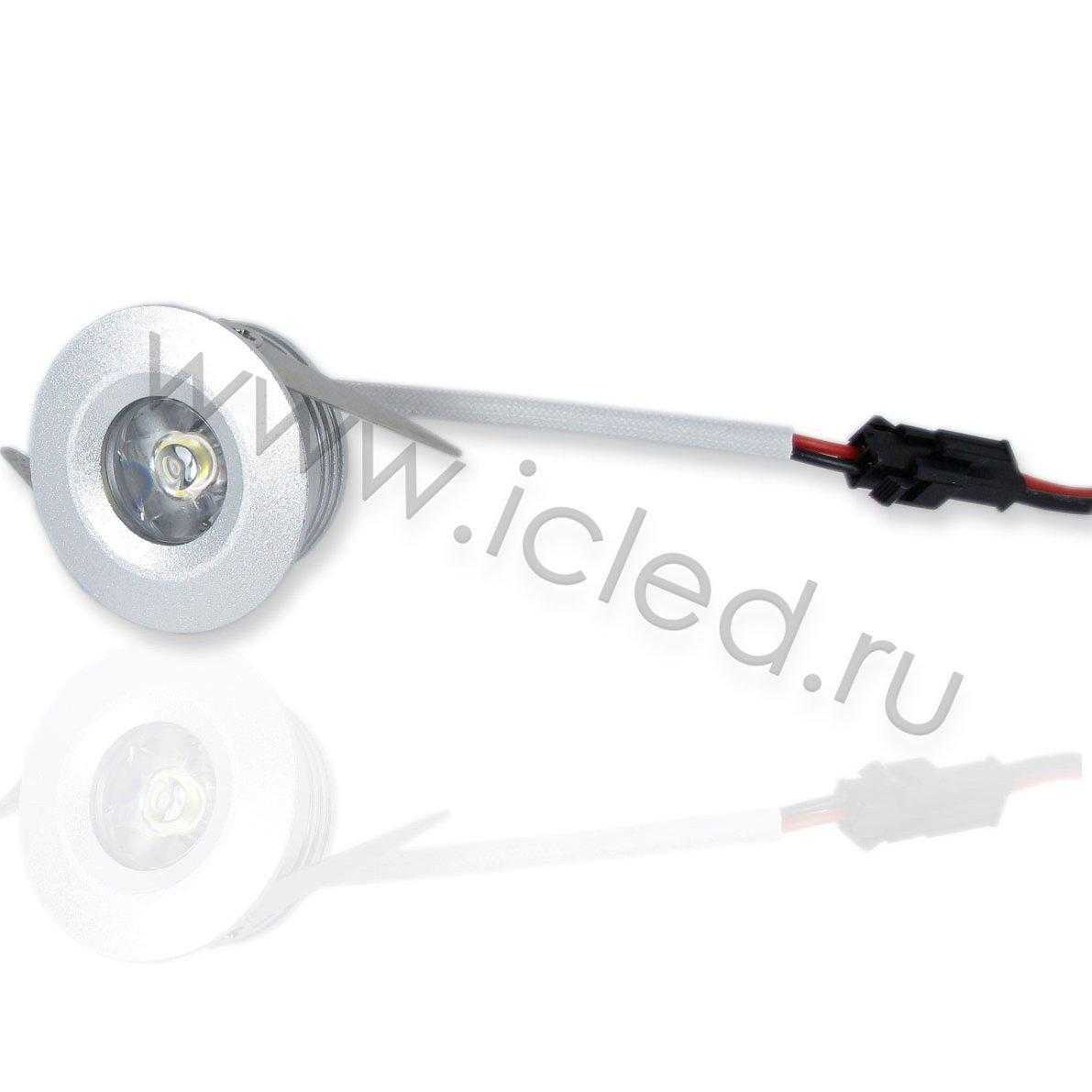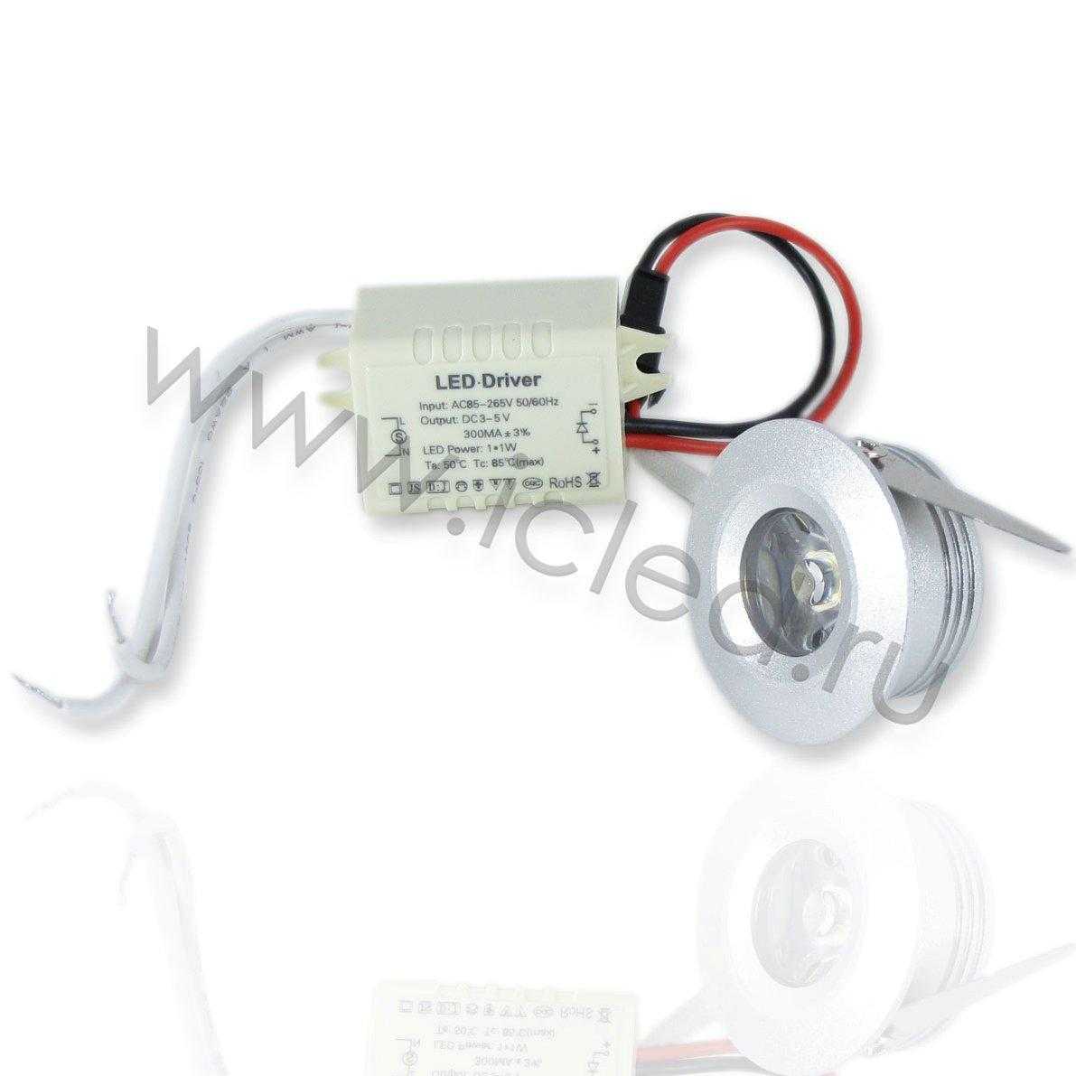 Точечный светодиодный светильник. Тип светодиода emmiter 1W - 1штука, цвет свечения теплый белый 3000-3200K, световой поток 100Lm, серебристый корпус. Напряжение 220V, мощность 1W, драйвер в комплекте. Диаметр 41мм.