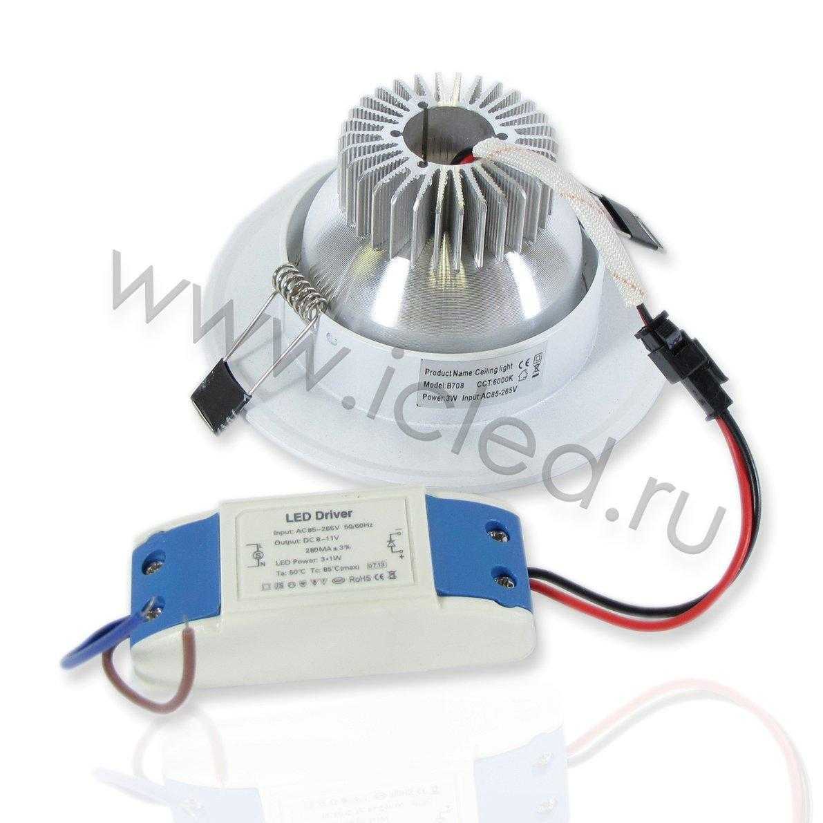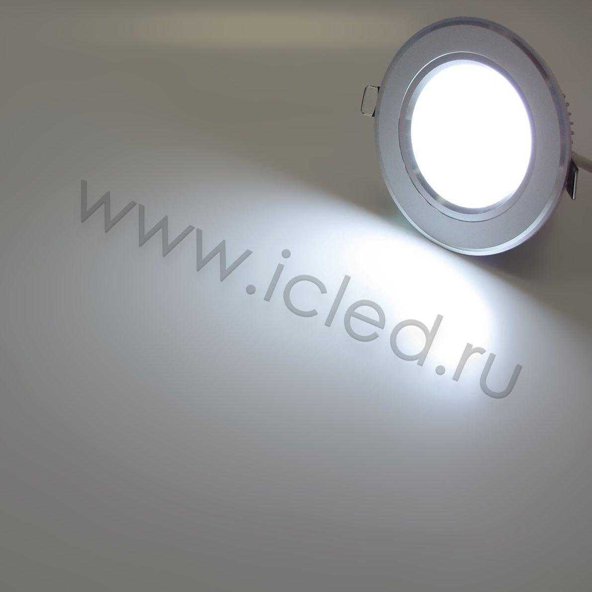Точечный светодиодный светильник. Корпус круглый. Матовое стекло. Напряжение 220V, мощность 3W, цвет свечения белый 6000-6300K, световой поток 270-300Lm.