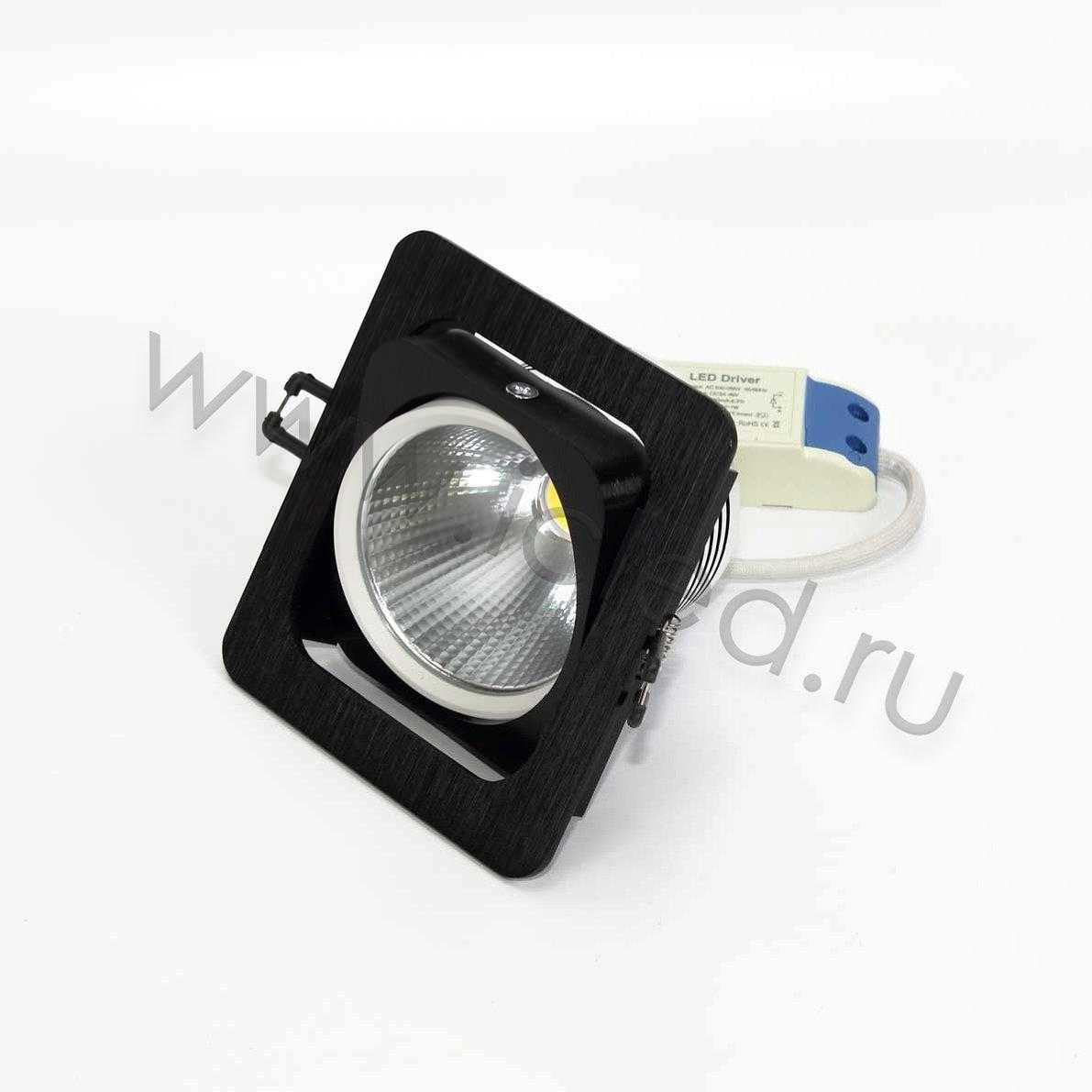 Светодиодный светильник. Квадратный черный корпус с белой рамкой. Напряжение 100-265V, мощность 10W, цвет свечения дневной белый 4000-4500K, световой поток 1200Lm, угол свечения 60 градусов. Размер 120х120х80мм. Установочный размер 105х105мм.