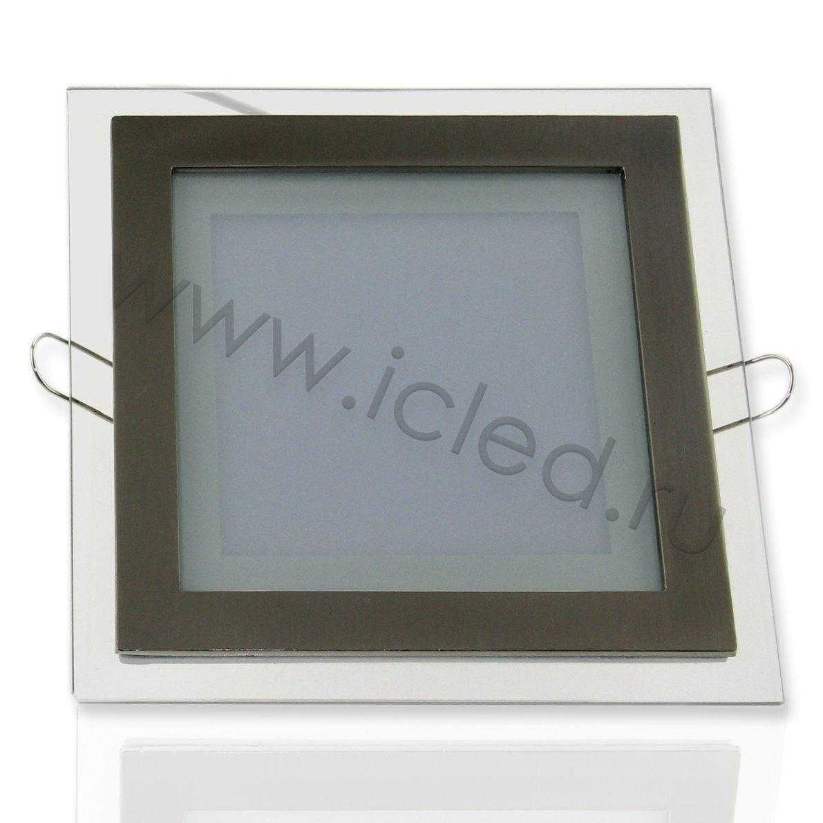 Потолочный светодиодный светильник с декоративным стеклом. Квадратный серебристый корпус с прозрачной стеклянной рамкой. Размер 200x200мм (под отверстие 165x165мм). Напряжение 220V, мощность 15W, цвет свечения белый 6000-6500K, световой поток 950Lm.