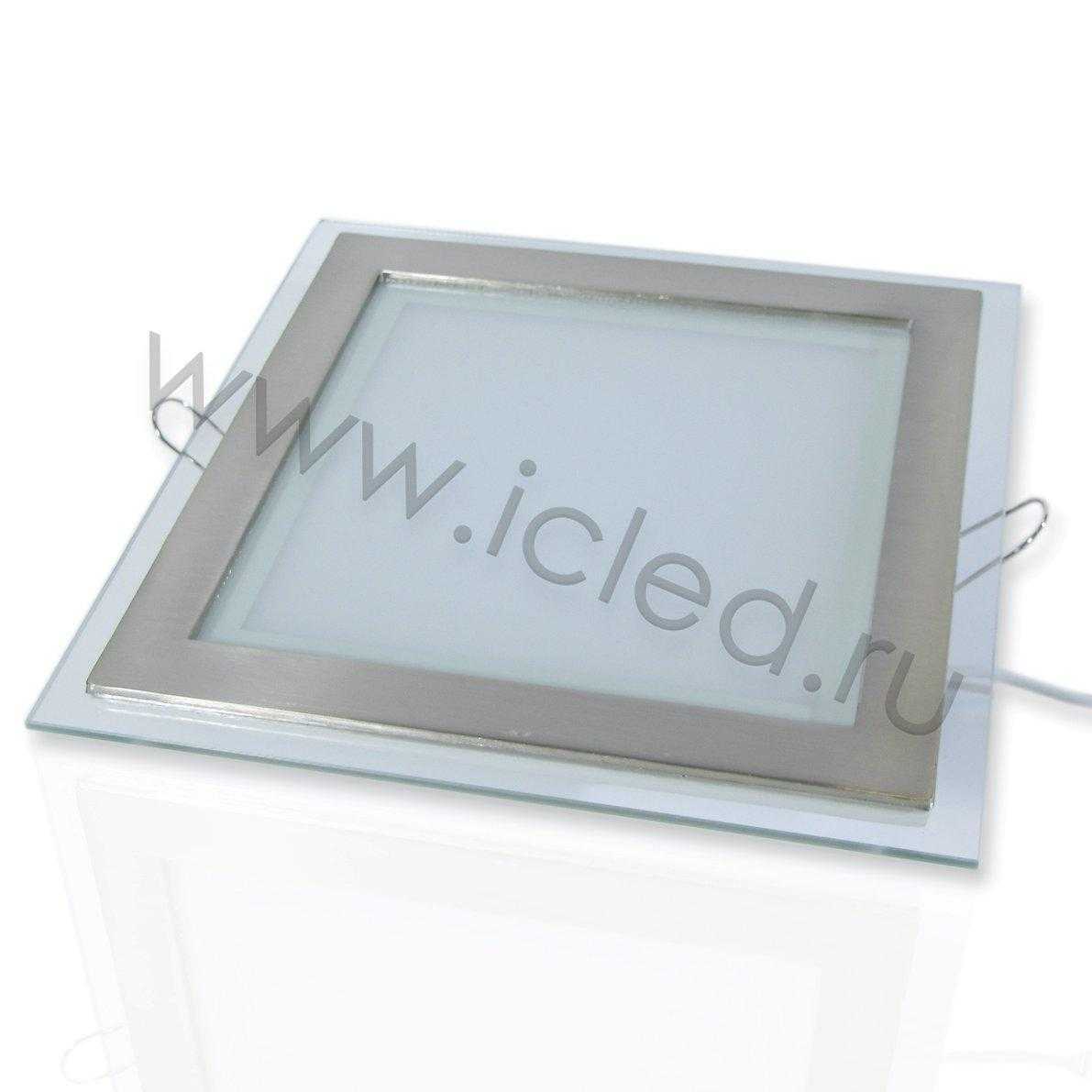 Потолочный светодиодный светильник с декоративным стеклом. Квадратный серебристый корпус с прозрачной стеклянной рамкой. Диаметр 200x200мм (под отверстие 165x155мм). Напряжение 220V, мощность 15W, цвет свечения теплый белый 3000-3200K, световой поток 950Lm.