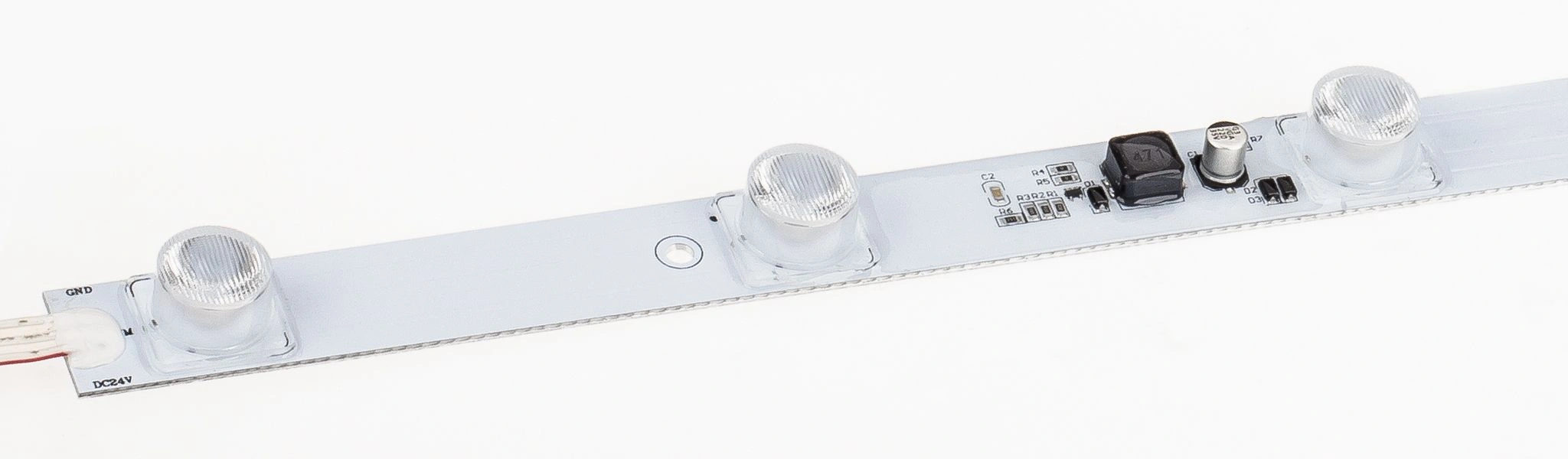 Герметичный светодиодный модуль-линейка ZM-5G-OS-24V White мощностью 15 Вт с белым цветом свечения 6000-7000К, световым потоком 1050 лм для создания качественной подсветки в наружной рекламе. Модуль-линейка состоит из 5 ярких светодиодов OSRAM. Напряжение питания 24 В безопасно и удобно в использовании, с помощью источника питания (поставляется отдельно) модули подключаются к сети 230В. Возможно использовать с диммерами для регулировки яркости. Линзы модулей с ассиметричной оптикой 15°/45° позволяют равномерно засветить конкретную область. Корпус выполнен с высокой защитой от пыли и влаги IP63, что позволяет использовать модули в уличных условиях при различной погоде. Длительная 5-летняя гарантия указывает на надежность и отличную работоспособность. Идеальное решение для двусторонней подсветки лайтбоксов глубиной 160-300 мм, вывесок-логотипов, стендов, экранов, декоративного оформления витрин.