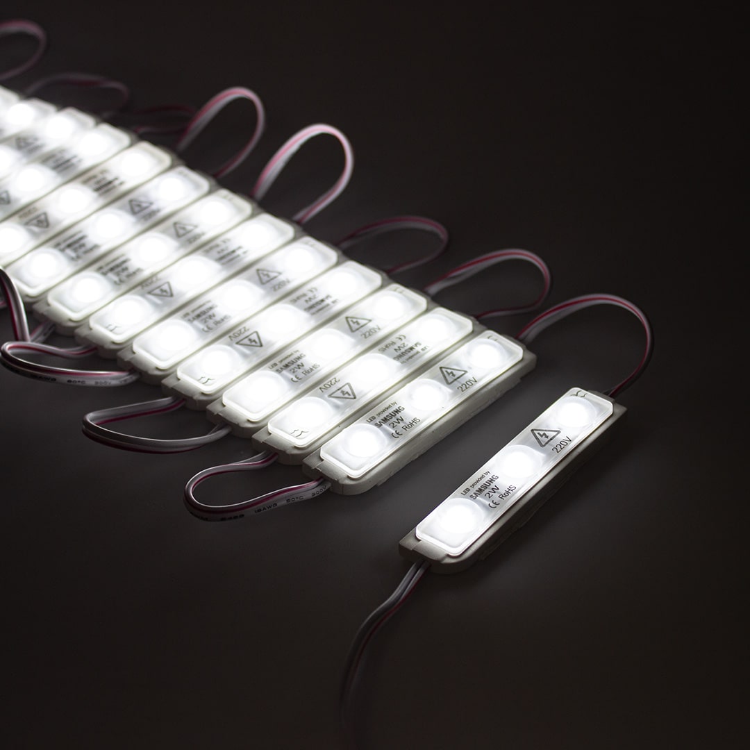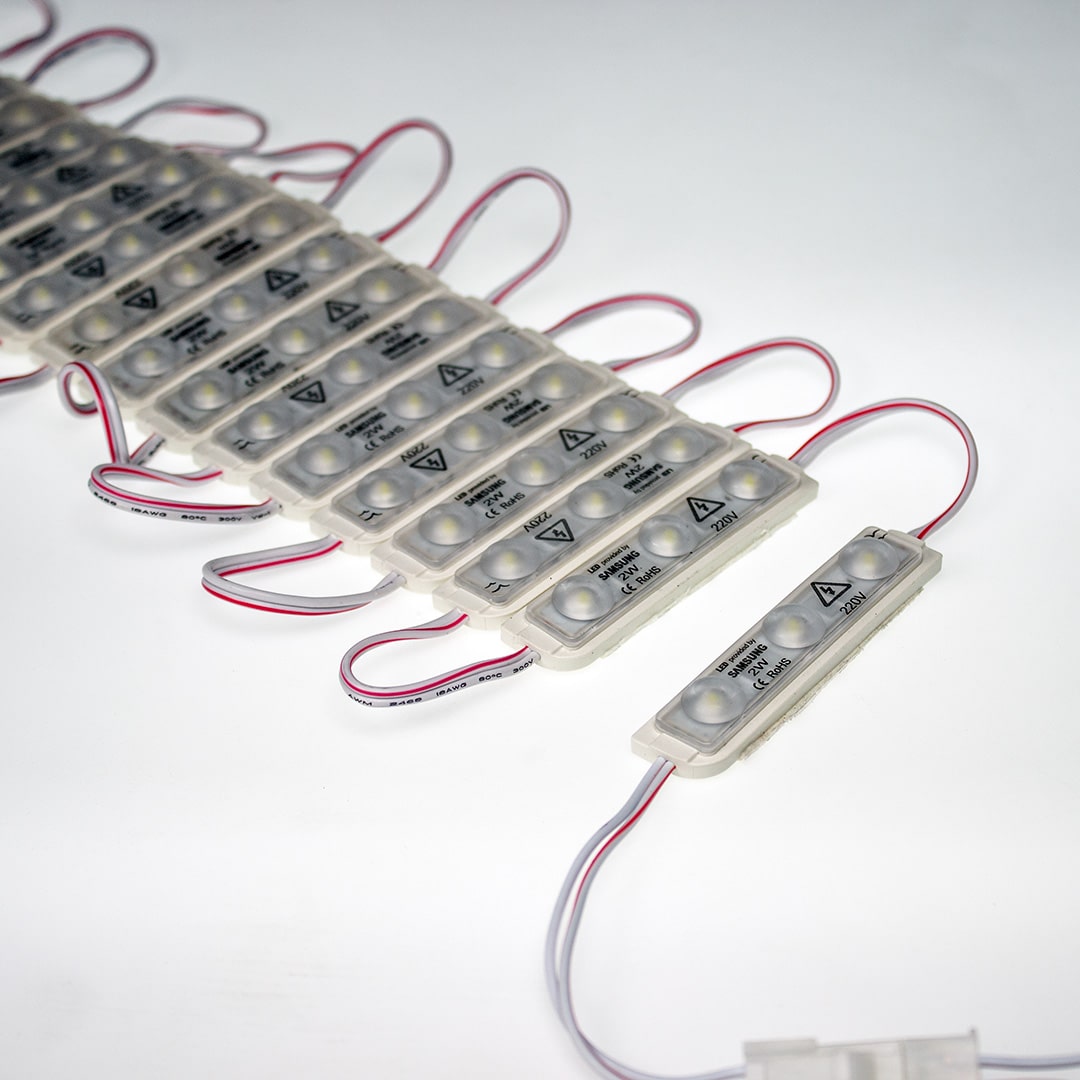 Светодиодный герметичный, линейный модуль Samsung. Тип светодиода 2835, количество светодиодов в модуле 3 штуки. Напряжение 220V, мощность 2W, световой поток 260Лм, цвет свечения белый 6200К, угол свечения 150 градусов. Степень защиты IP65. Длина провода между модулями 80мм. Упаковка 20 штук. Вес упаковки 250г. Размеры 78x17x10мм. Размеры упаковки 350x80x10мм.