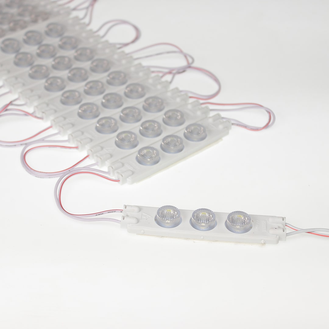 Светодиодный герметичный, линейный модуль. Тип светодиода 3030, количество светодиодов в модуле 3 штуки. Напряжение 220V, мощность 2W, световой поток 260-300Лм, цвет свечения холодный белый 16000К, угол свечения 45x15 градусов. Степень защиты IP65. Длина провода между модулями 100мм. Упаковка 20 штук. Вес упаковки 250г. Размеры 96x21x10мм. Размеры упаковки 430x100x10мм.