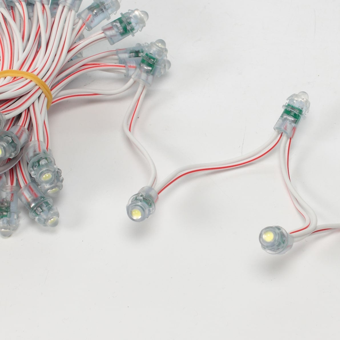 Светодиодный герметичный модуль. Тип светодиода 9мм, под установочное отверстие 8мм, количество светодиодов 1 штука. Напряжение 12V, мощность 0,2W, цвет свечения холодный белый 20000К, угол свечения 120 градусов, длина провода 60мм. Класс защиты IP65. Упаковка 50 штук. Диаметр 9 мм, высота 19 мм. Вес 90г.
