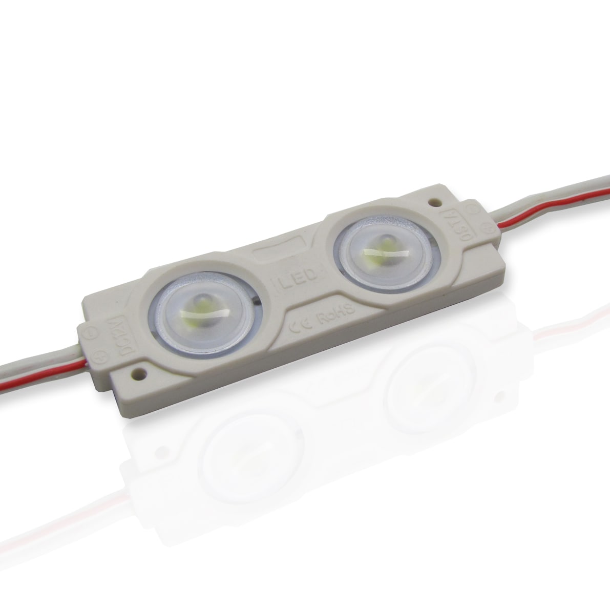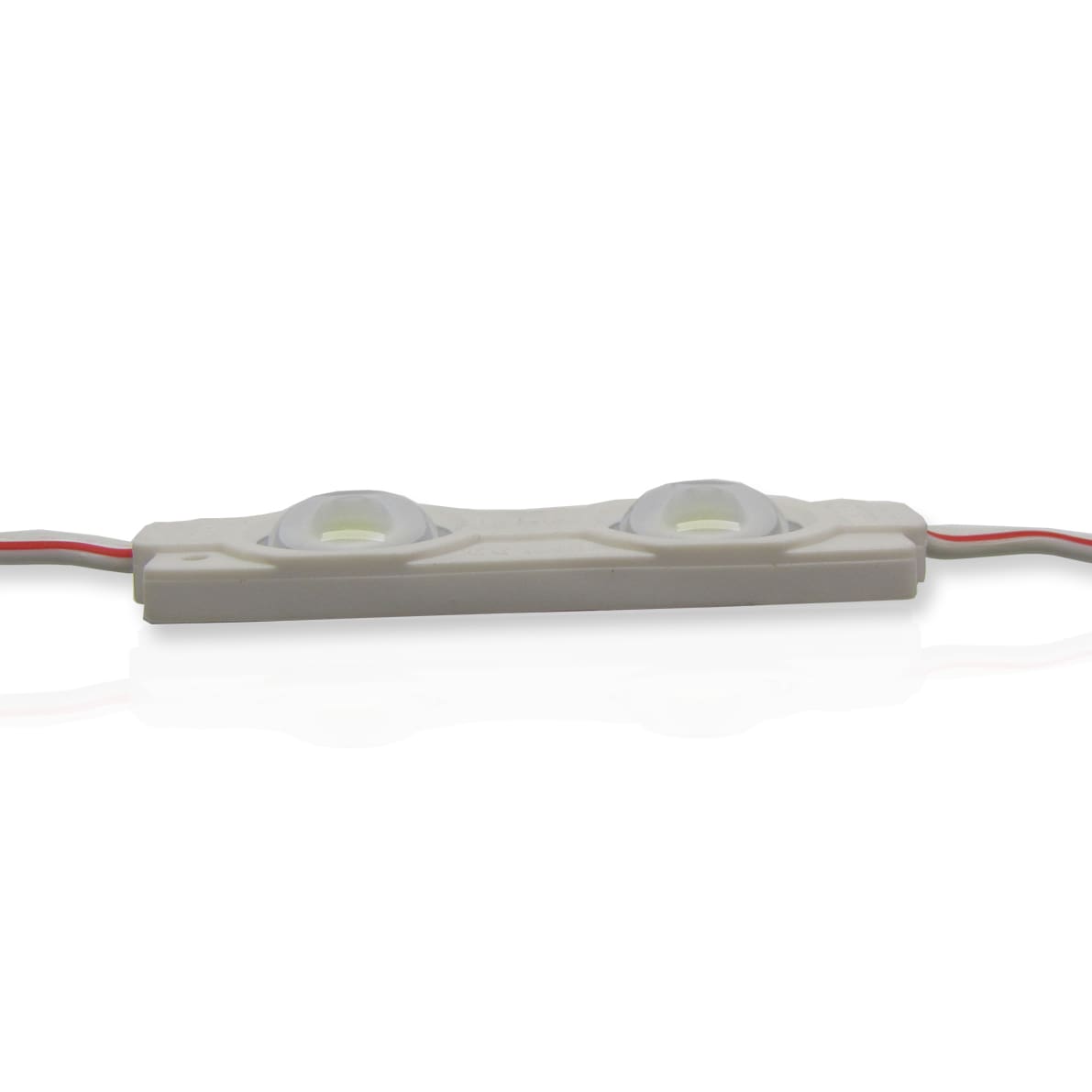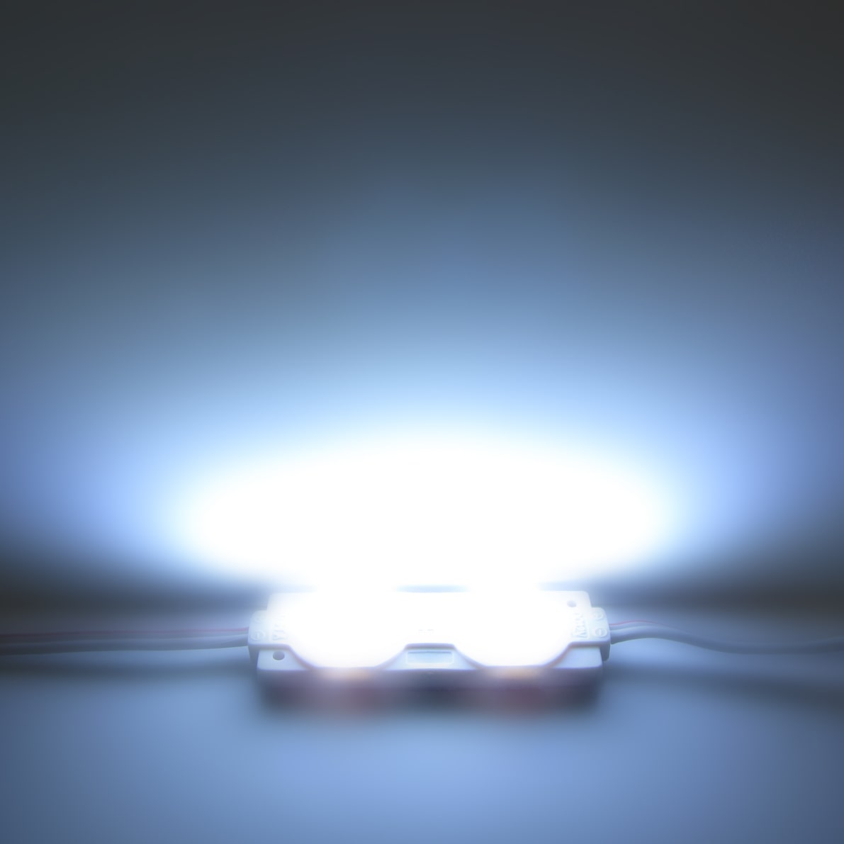 Светодиодный герметичный модуль. Тип светодиода 5730, прямоугольный количество светодиодов 2 штуки. Напряжение 12V, мощность 1,2W, цвет свечения холодный белый 10500K, световой поток 102Lm, угол свечения 152 градуса. Класс защиты IP65. Упаковка 20 штук. Размеры 58x18x9мм. Длина провода 135мм.