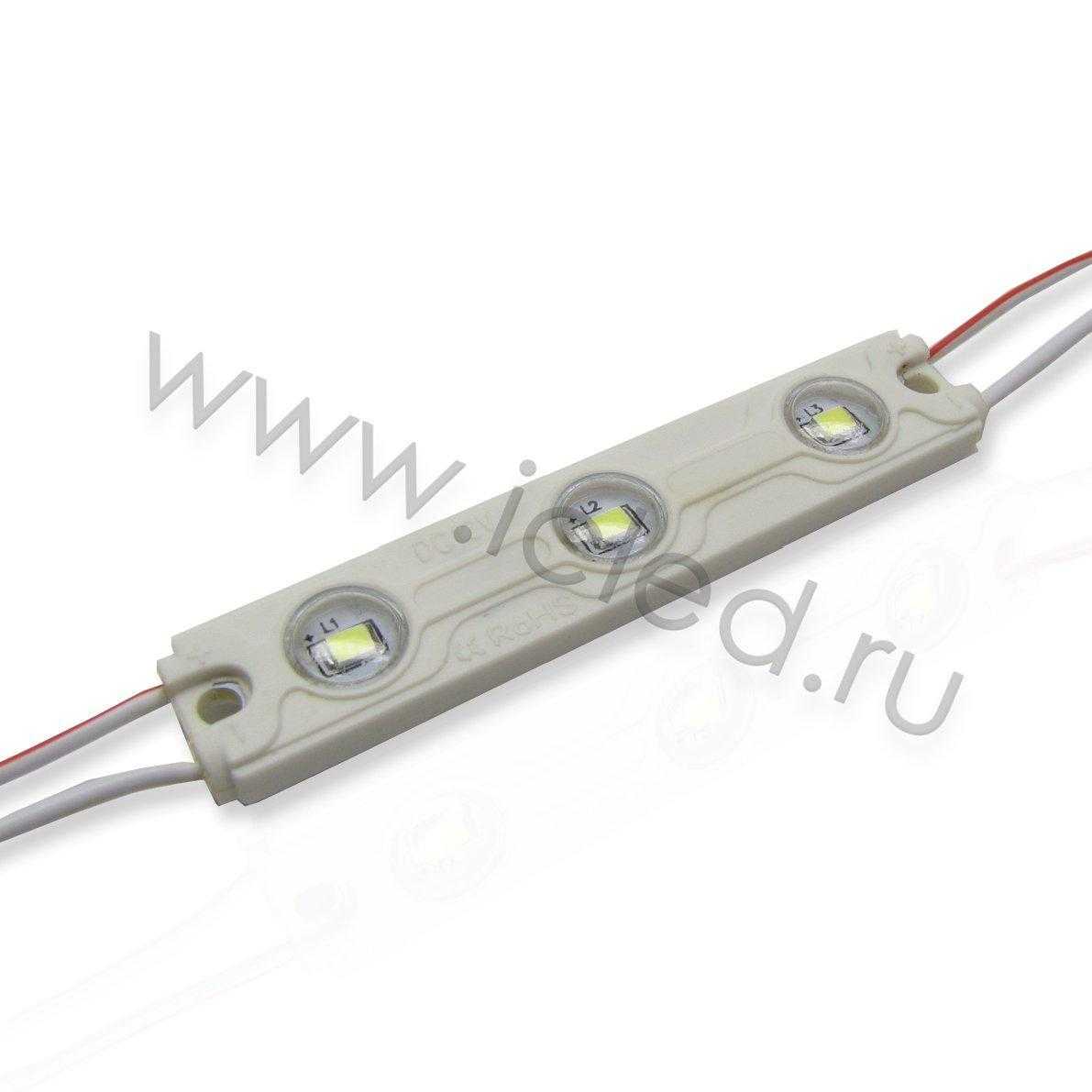 Светодиодный герметичный модуль. Тип светодиода 2835, прямоугольный количество светодиодов 3 штуки. Напряжение 12V, мощность 0,6W, цвет свечения холодный белый 8800K, световой поток 45Lm, угол свечения 152 градуса. Класс защиты IP65. Упаковка 20 штук. Размеры 76x15x7,5мм. Длина провода 85мм.