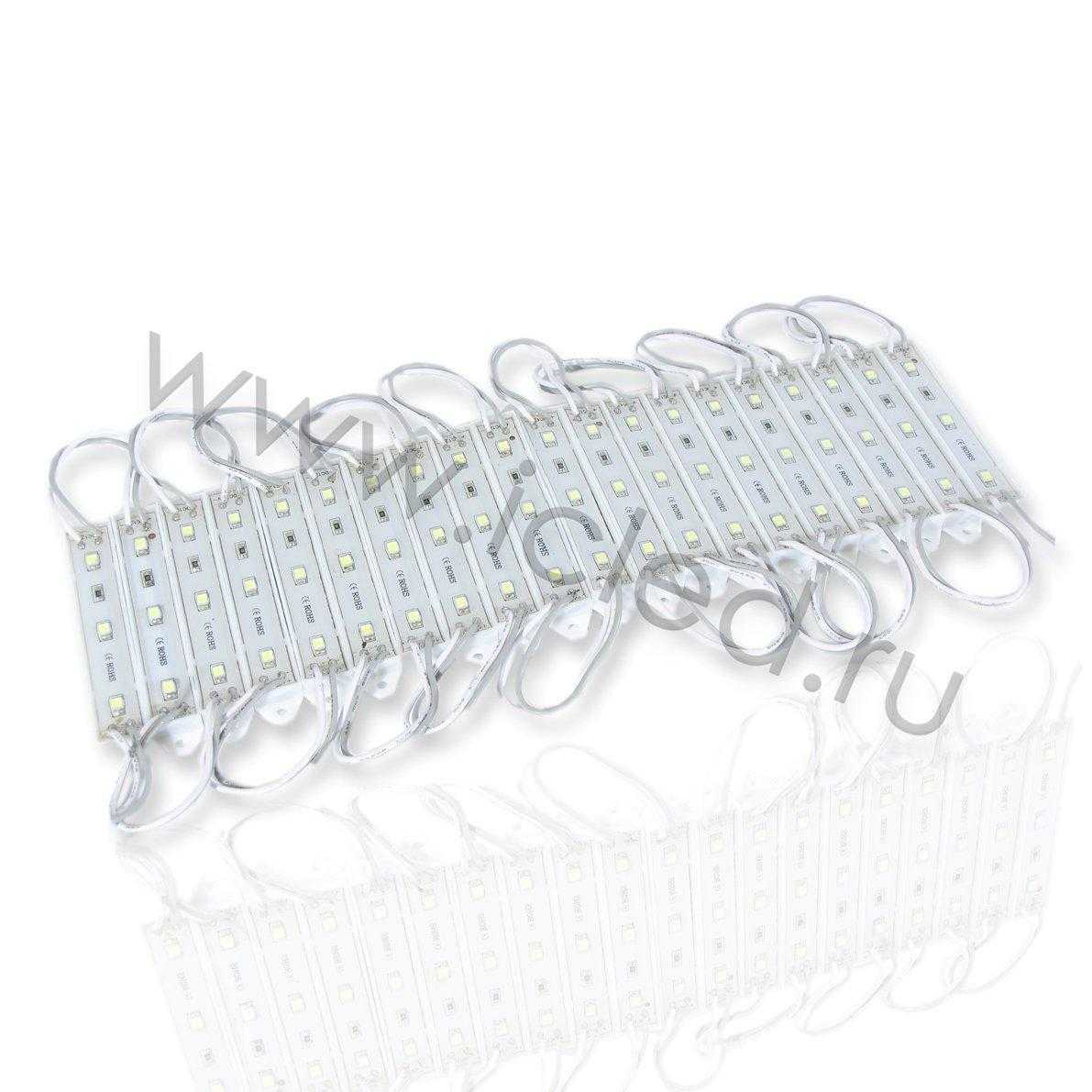 Светодиодный герметичный модуль. Тип светодиода 3528, линейный, количество светодиодов 3 штуки. Напряжение 12V, мощность 0,2W, цвет свечения белый 6500-7000К, угол свечения 120 градусов. Класс защиты IP65. Упаковка 20 штук. Размеры 92x14x8мм.