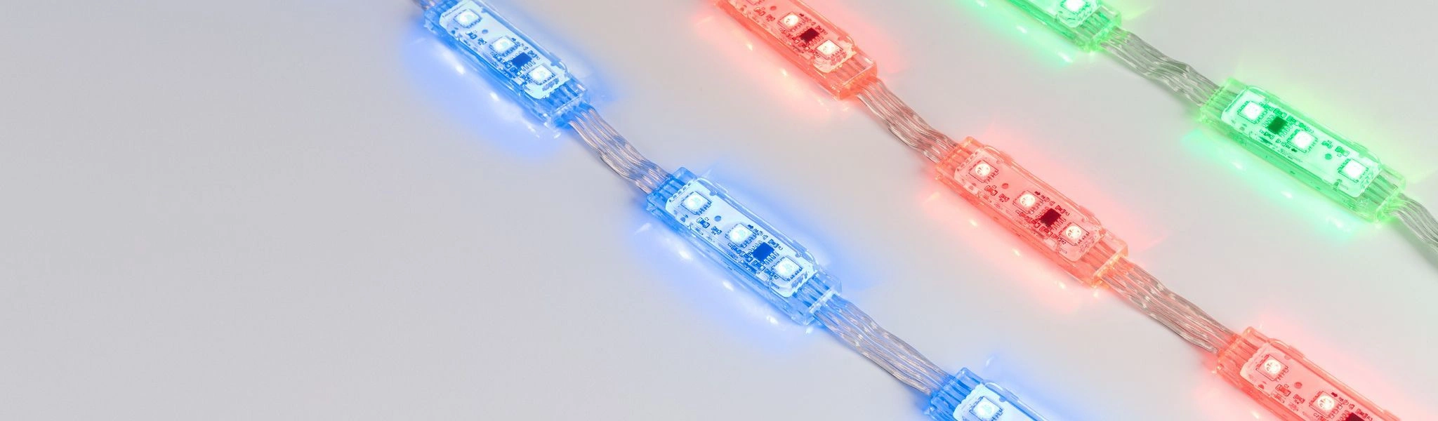 Управляемый светодиодный модуль DMX, RGB, микросхема DMX512 (UCS512), напряжение 12 В, мощность 0.72 Вт, 3 светодиода SMD 5060, угол 140°. Создание медиафасадов, 20 шт на проводе, расстояние между центрами модулей 100 мм, длина провода между модулями 40 мм. Степень пылевлагозащиты IP68. Размер 60x15х10 мм. Гарантия 3 года.