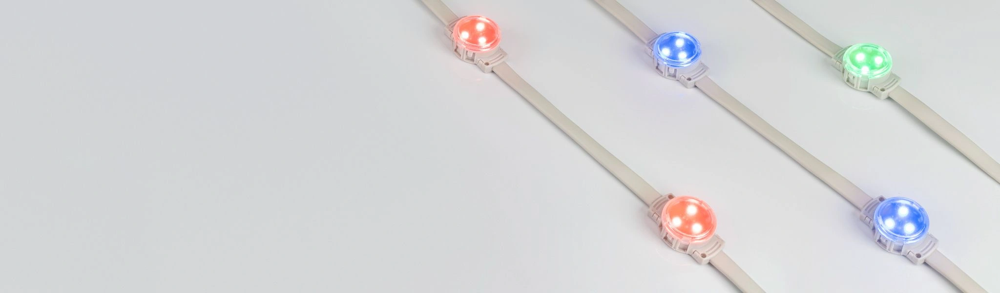 Управляемый светодиодный модуль DMX, RGB, микросхема SM16511, напряжение 12 В, мощность 0.75 Вт, 3 светодиода SMD 3535, угол 120°. Создание медиафасадов, 30 шт на проводе, расстояние между центрами модулей 170 мм, длина провода между модулями 125 мм. Степень пылевлагозащиты IP68. Размер Ø30×44×16 мм. Гарантия 3 года.
