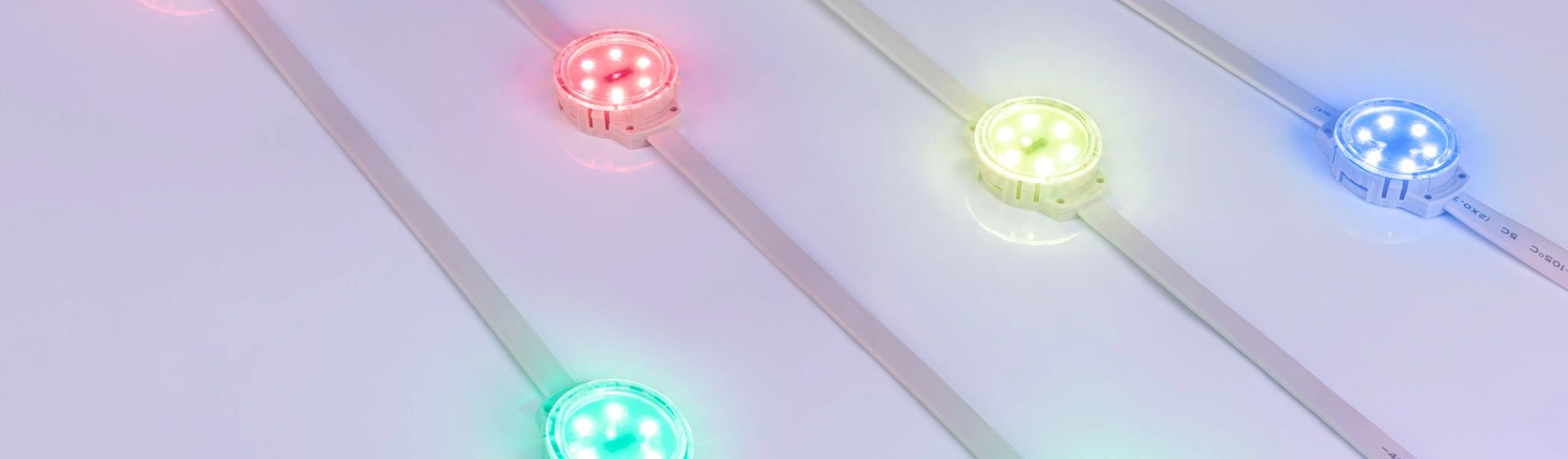 Управляемый светодиодный модуль DMX с держателем, RGB, микросхема UCS512С4, напряжение 24 В, мощность 1.5 Вт, 6 светодиодов SMD 3535, угол 120°. Создание медиафасадов. 20 шт на проводе, расстояние между центрами модулей 200 мм, длина провода между модулями 155 мм. IP67. Размер Ø39.5×16 мм. Гарантия 3 года.