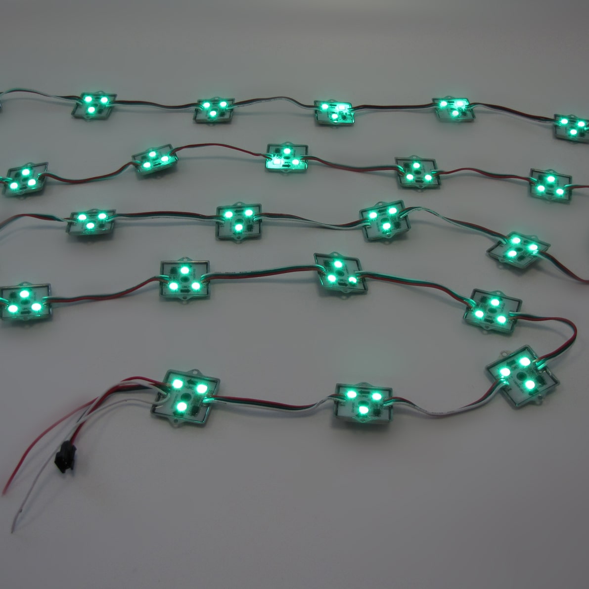 Светодиодный герметичный управляемый модуль. С встроенной микросхемой WS2811. Тип светодиода 5050, количество светодиодов 3 штуки. Напряжение 12V, мощность 0,72W, цвет свечения RGB, угол свечения 120 градусов, длина провода 80мм. Класс защиты IP65. Упаковка 25 штук. Размеры 36x45x7мм.