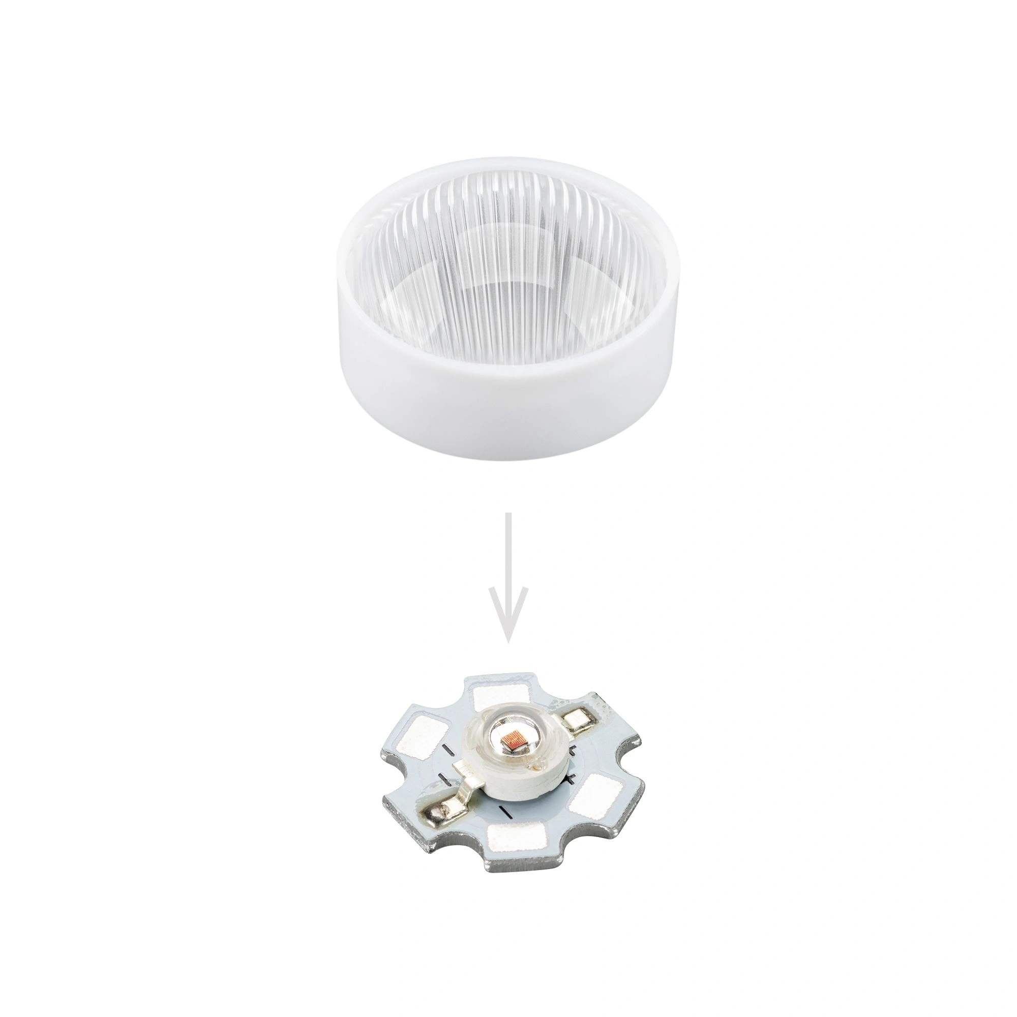 Одиночная линза со съемным холдером белого цвета для мощного светодиода Emitter. Угол обзора: вертикальный 65°, горизонтальный 120°, прозрачная микропризма. Материал PMMA. Диаметр 24.6 мм, высота 13.93 мм. Великолепно подходит для RGB-mix смешивания.