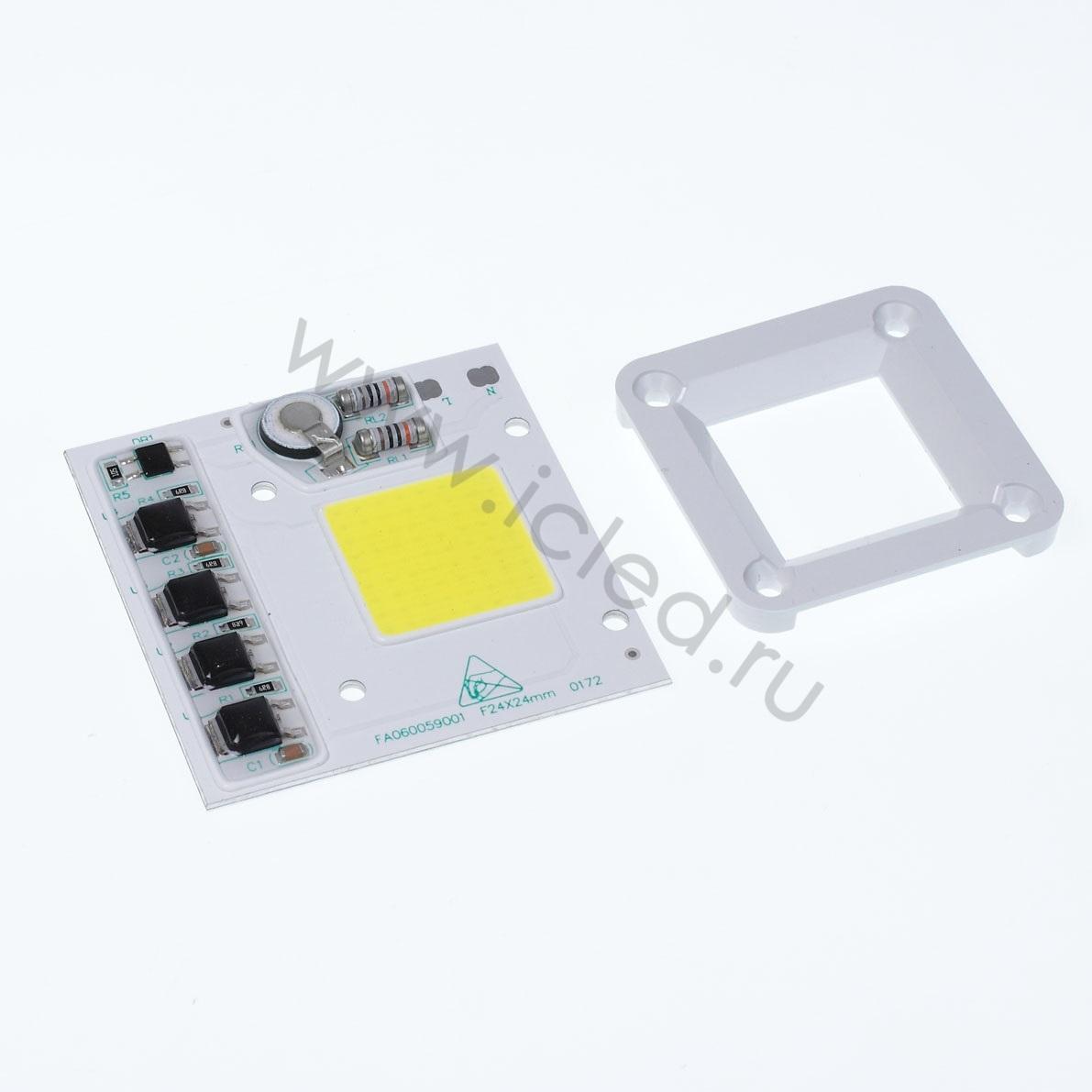 Светодиодная матрица COB на металлической подложке. Цвет белый, температура свечения 5700K, мощность 50W, напряжение 220V, световой поток 5000Lm, PF 0,9. Угол свечения 120 градусов. Размер 60x59мм, размеры установочных отверстий 34x34мм, световое поле 24x24мм. Устанавливать на теплоотвод.
