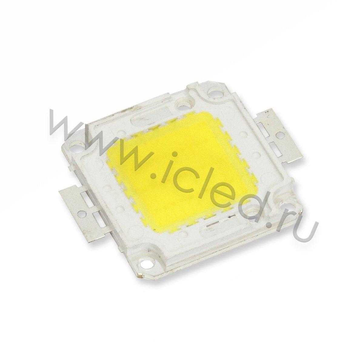 Светодиодная матрица COB. Цвет свечения дневной белый, температура свечения 4000-4500K, мощность 30W, напряжение 30-32V, ток 900mA, световой поток 2700Lm, угол 120 градусов. Размеры 42x52x5мм. Вес 24г. Устанавливать на теплоотвод.