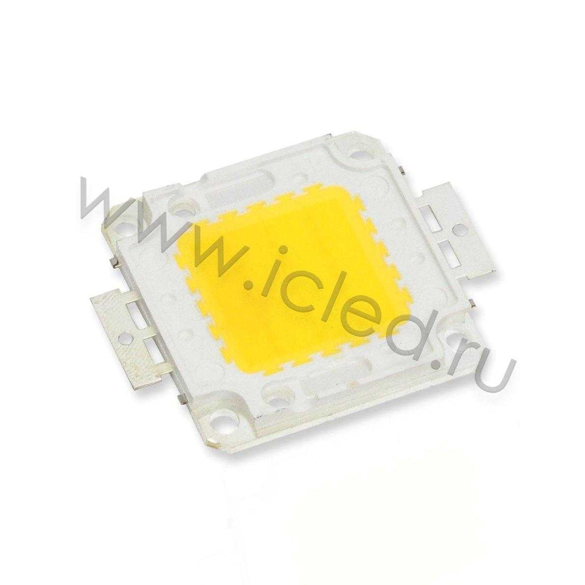 Светодиодная матрица COB. Цвет свечения теплый белый, температура свечения 3000-3500K, мощность 30W, напряжение 30-36V, ток 1050mA, световой поток 2700Lm, угол 120 градусов. Размеры 42x52x5мм. Вес 24г. Устанавливать на теплоотвод.