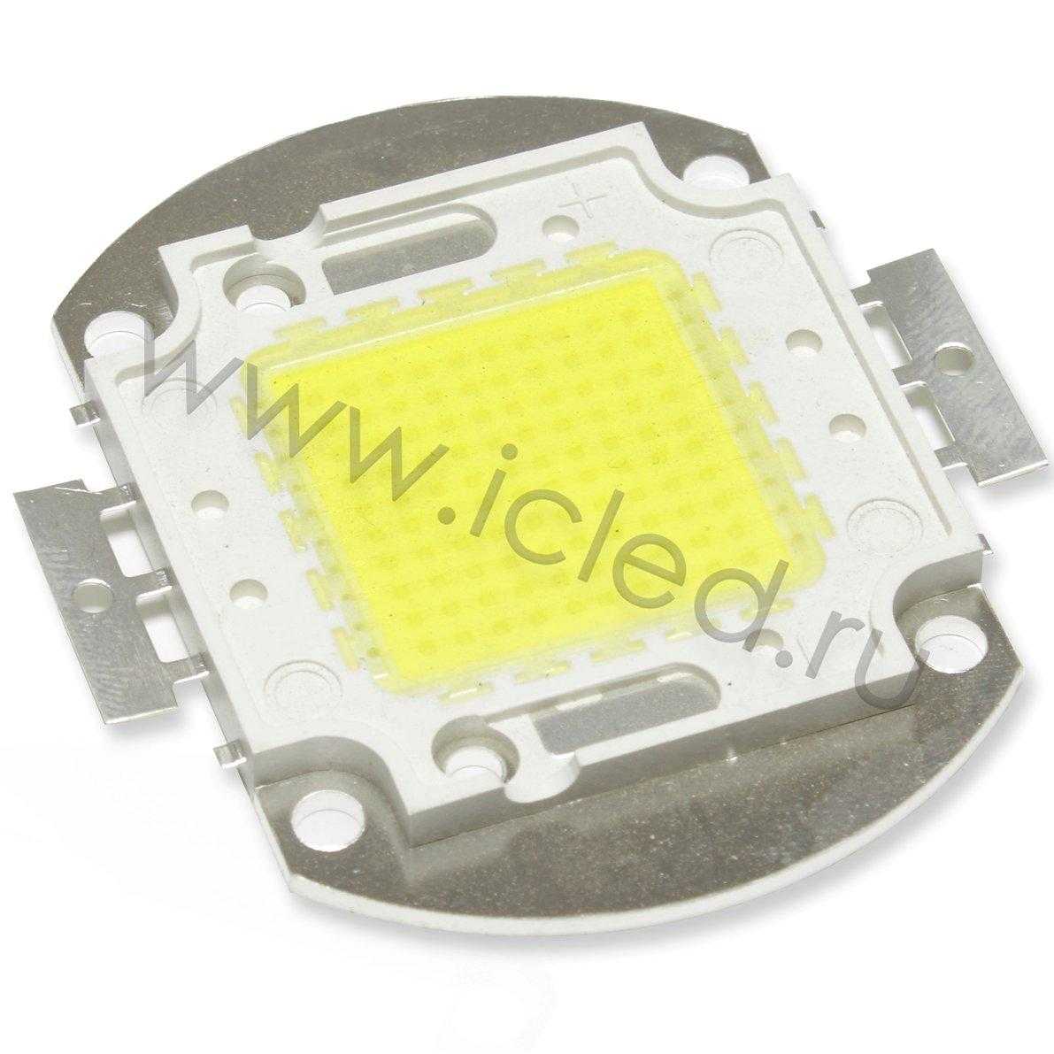Светодиодная матрица COB. Цвет белый, температура свечения 6000K, мощность 100W, напряжение 30-35V, ток 3500mA, световой поток 9000Lm, угол 110-140 градусов. Размеры 52x56x4.4мм. Устанавливать на теплоотвод.