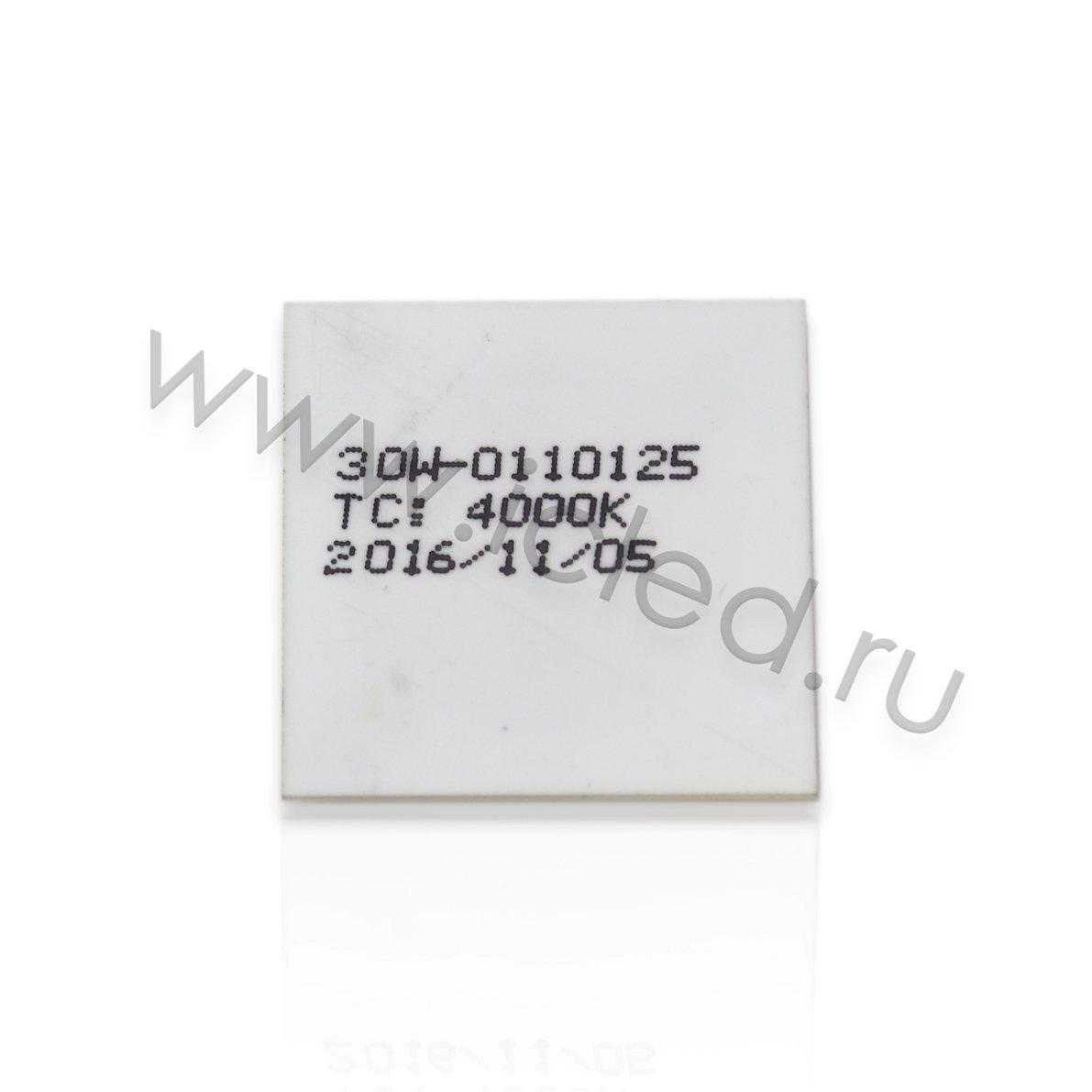 Светодиодная COB матрица. Цвет свечения дневной белый 4000К. Керамическая подложка. Напряжение питания 30-33В, номинальный ток 900мА, потребляемая мощность 30Вт. Световой поток 2800-3000Лм. Размеры 28х28х2мм. Диаметр светящегося поля 23мм. Устанавливать на теплоотвод.