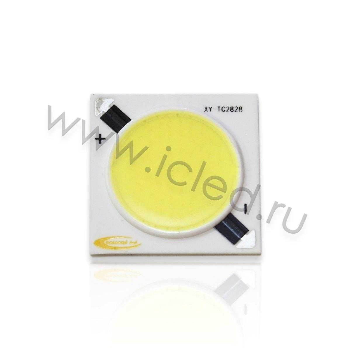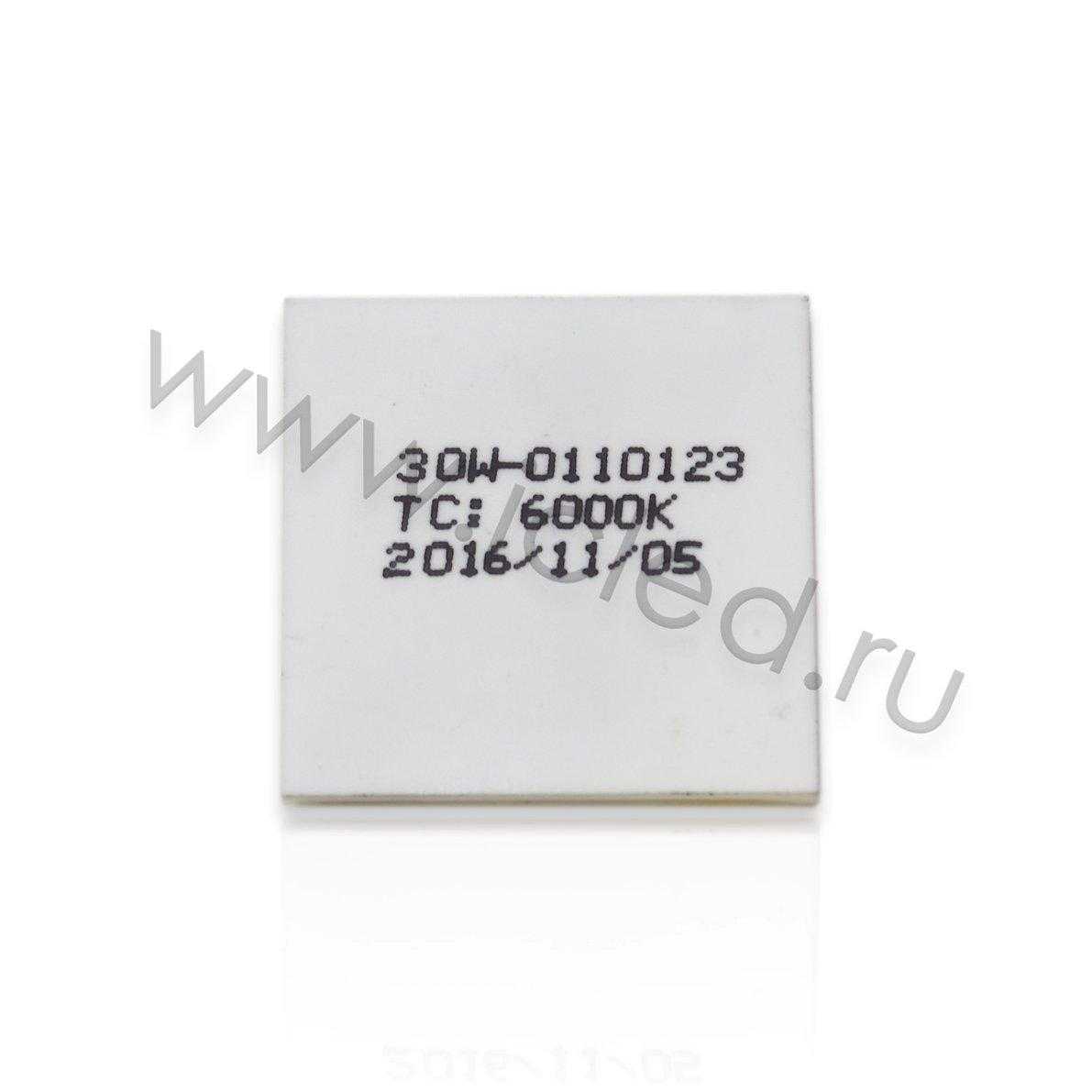 Светодиодная COB матрица. Цвет свечения белый 6000К. Керамическая подложка. Напряжение питания 30-34В, номинальный ток 900мА, потребляемая мощность 30Вт. Световой поток 2800-3000Лм. Размеры 28х28х2мм. Диаметр светящегося поля 23мм. Устанавливать на теплоотвод.