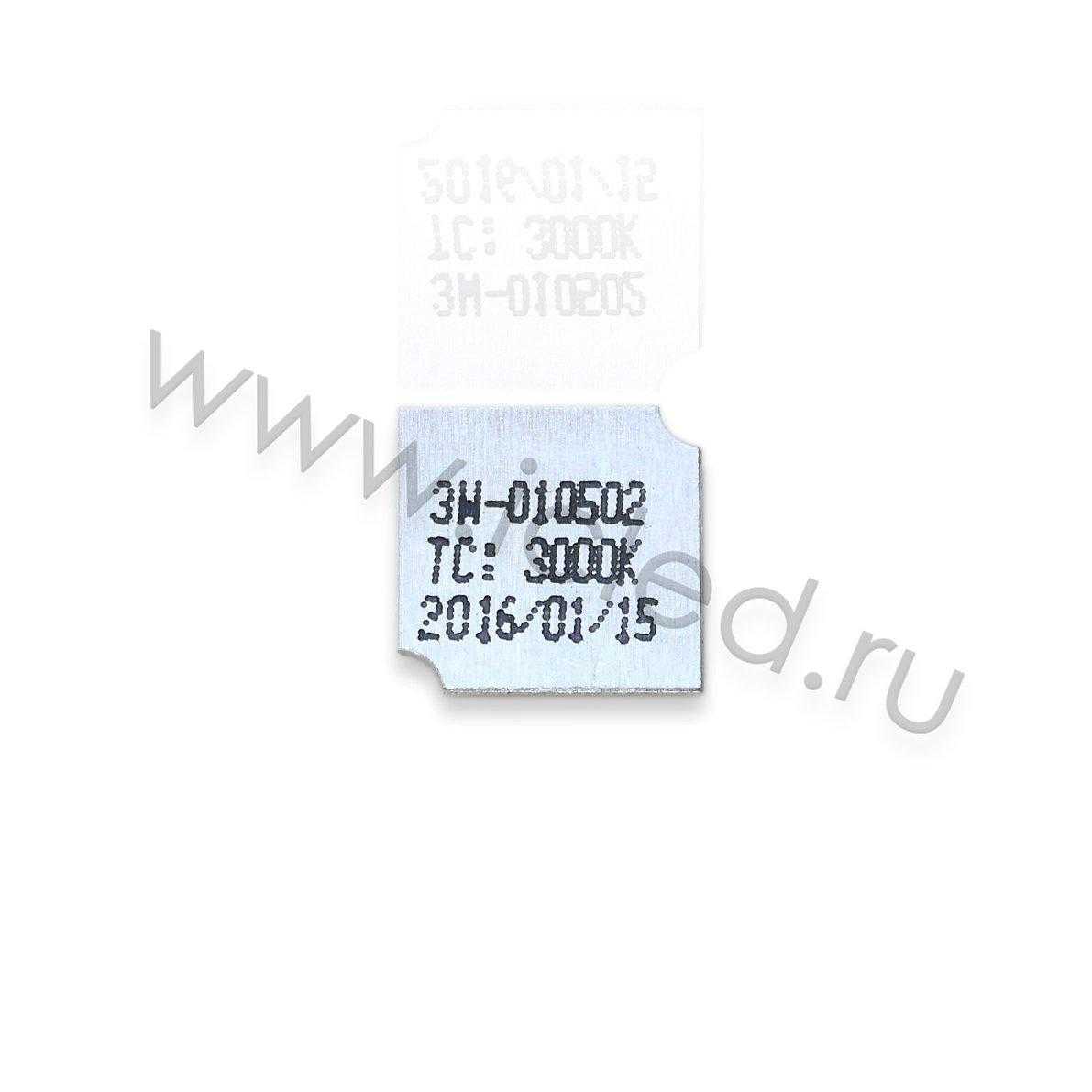 Светодиодная COB матрица. Цвет свечения теплый белый 3000К. Алюминиевая подложка. Напряжение питания 9-10В, номинальный ток 300мА, потребляемая мощность 3Вт. Световой поток 300Лм. Размеры 13,5х13,5х1,7мм. Диаметр светящегося поля 11мм. Устанавливать на теплоотвод.