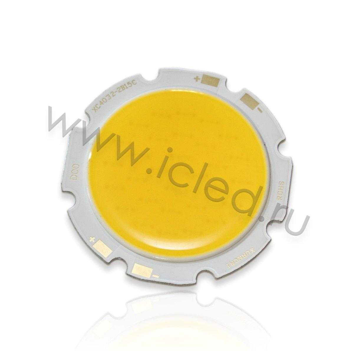 Светодиодная COB матрица. Цвет свечения теплый белый 3000К. Алюминиевая подложка. Напряжение питания 45-48В, номинальный ток 300мА, потребляемая мощность 15Вт. Световой поток 1500Лм. Диаметр 40мм, высота 2,35мм. Диаметр светящегося поля 32мм. Устанавливать на теплоотвод.