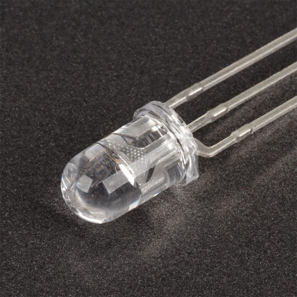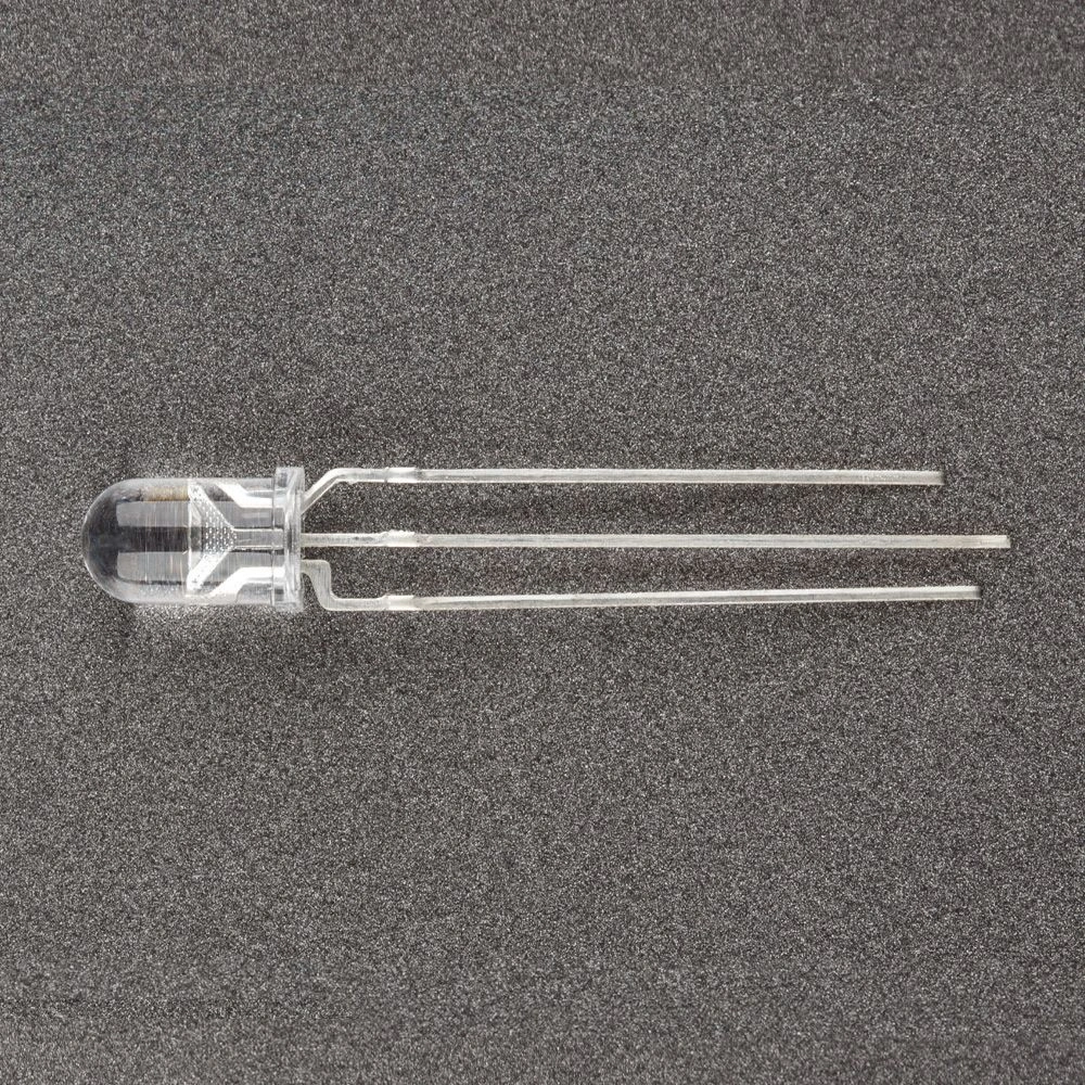 Поставка под заказ от 5000 шт. Выводной круглый светодиод, d=5 мм, прозрачная линза. Цвет свечения красный (630 нм), зеленый (570 нм). Угол излучения 30-40°. Сила света Iv=200-400 мкд при If=20 мА. VF=1.9-2.4 В (красный), 2.3-3.5 В (зеленый). Три вывода, общий катод.