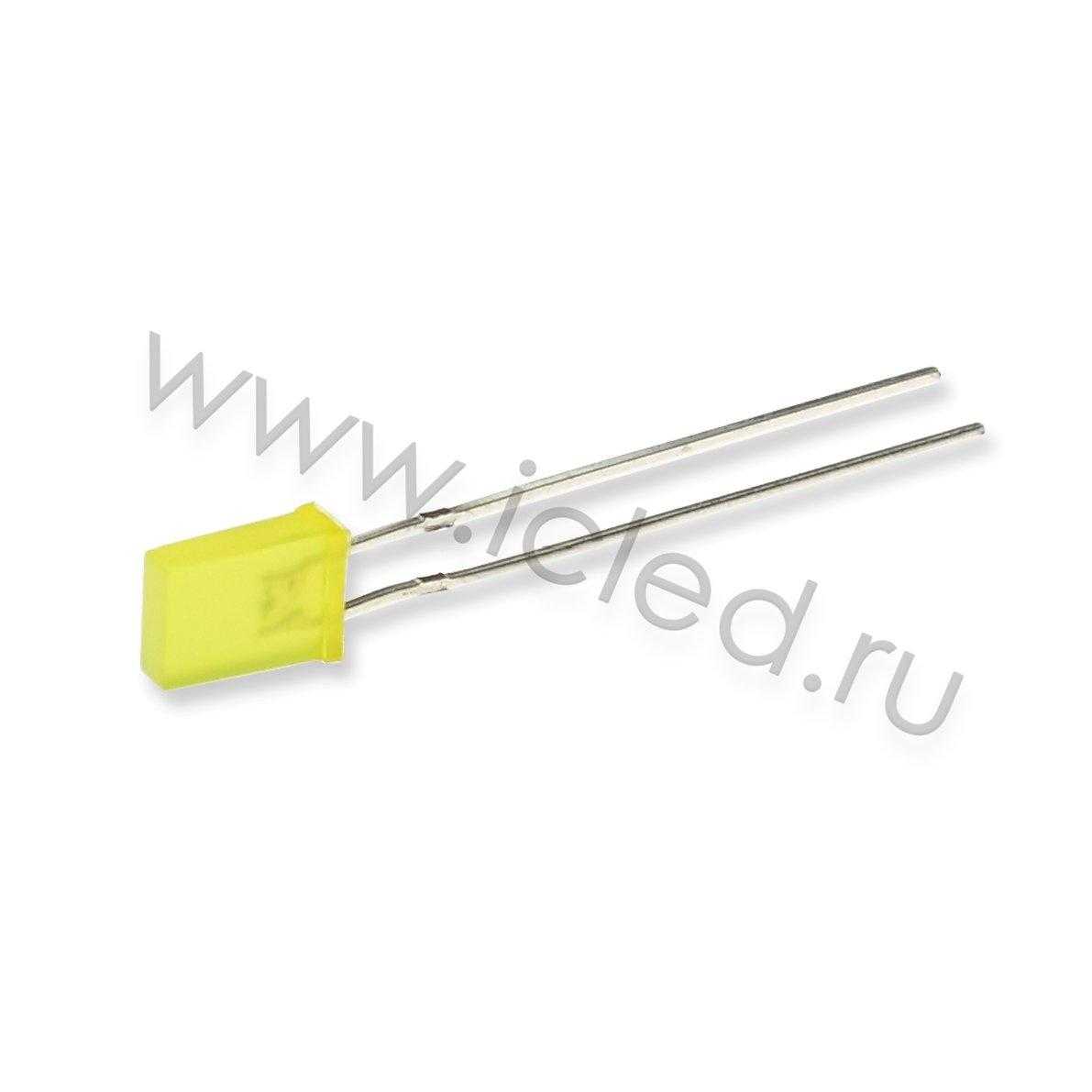 Светодиод выводной прямоугольный. Диффузный желтый корпус. Цвет свечения желтый (585нм). Падение напряжения 1,9-2,3В, прямой потребляемый ток 20мА. Угол свечения 80 градусов. Яркость 200-400мкд. Размеры 2х5х7мм. Упаковка 1000 шт.
