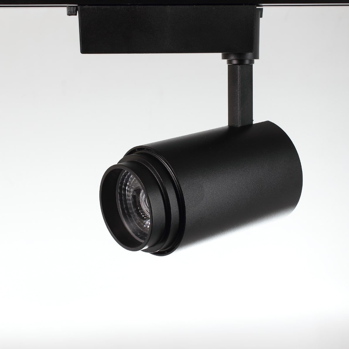 Светодиодный трековый светильник. Черный корпус. Напряжение 85-265V, мощность 30W, цвет свечения теплый белый 3000-3500K, световой поток 3000Lm. Угол свечения 30 градусов. Класс защиты IP40. Высота 160мм, диаметр 95мм. Размеры упаковки 220x220x100мм. Вес 1150г
