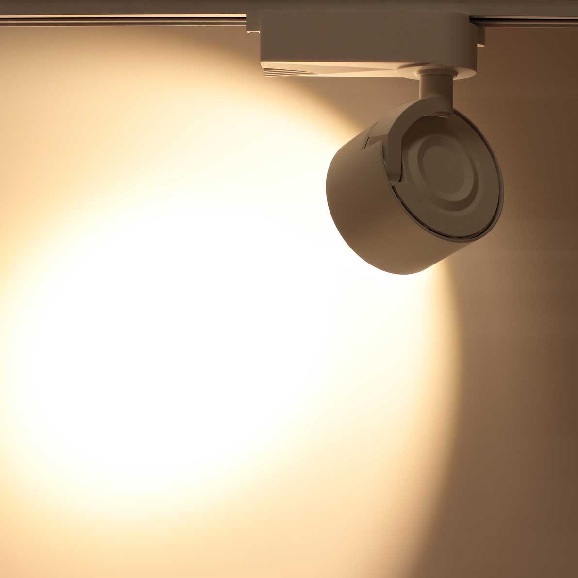 Светодиодный трековый светильник. Стильный белый корпус. Напряжение 85-265V, мощность 20W, цвет свечения теплый белый 3000-3500K, световой поток 2000Lm. Угол свечения 30 градусов. Класс защиты IP40. Размеры 190x102x170мм. Вес 530г
