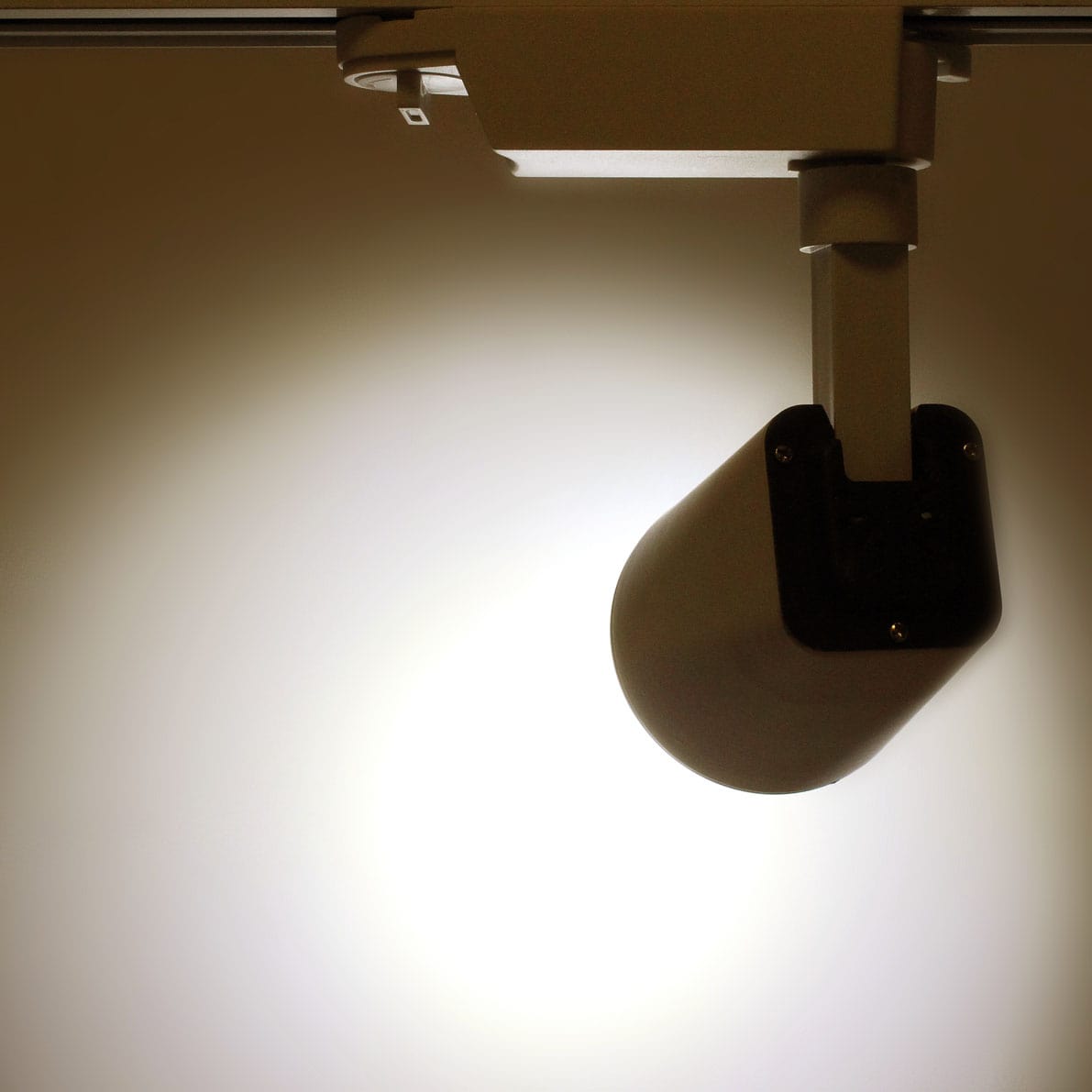 Трековый светильник. Белый корпус. Технология COB. Напряжение 85-265V, мощность 10W, цвет свечения теплый белый 3000K, световой поток1000Lm. Угол свечения 45 градусов. Класс защиты IP20. Размеры 170x70x160мм